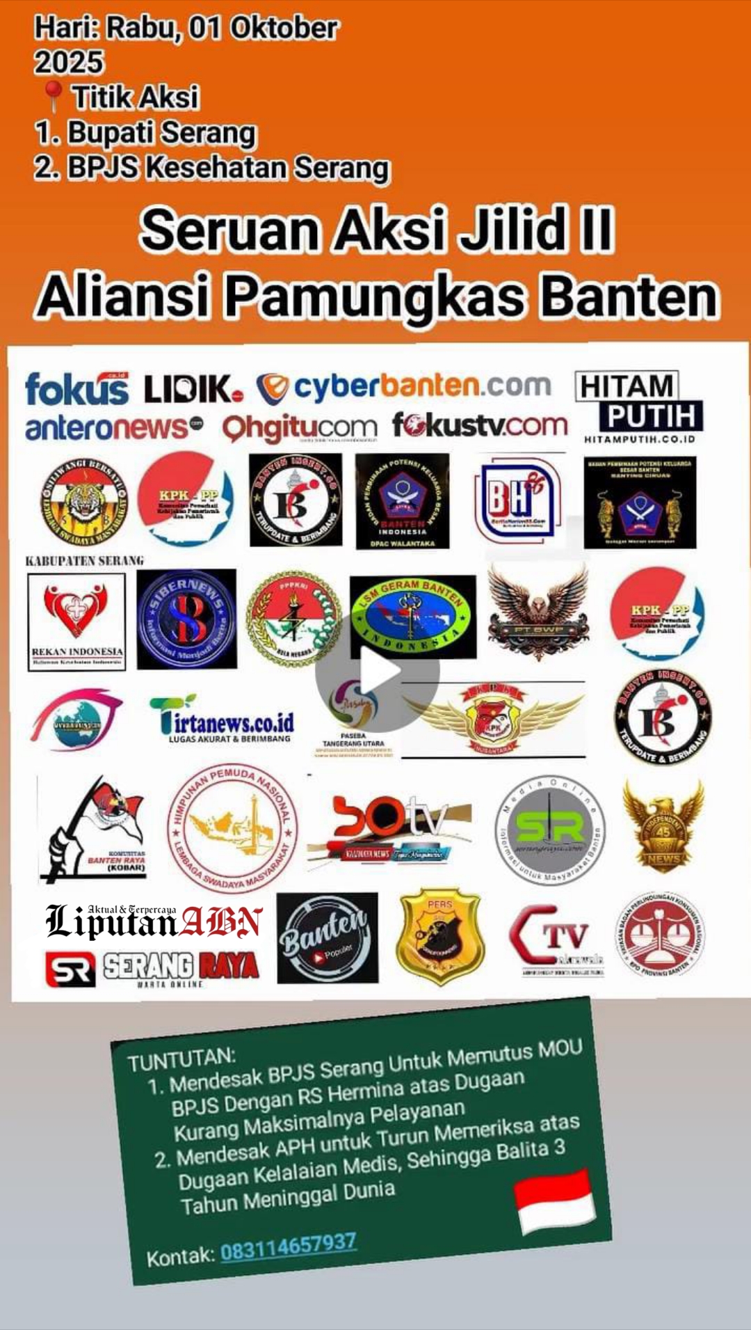 Liputanabn.com | Kabupaten Serang – Buntut Penolakan Pasien Darurat Yang Menggunakan BPJS yang “di Duga ditolak ” oleh Rumah Sakit Hermina Ciruas Puluhan Aktifis Yang Tergabung Dalam Aliansi Pamungkas Banten, Akan Melakukan Aksi Unjuk Rasa Pada Hari Rabu 1/10 /2025 di Kantor Bupati Serang dan Kantor BPJS, Selasa( 30/09/2025)