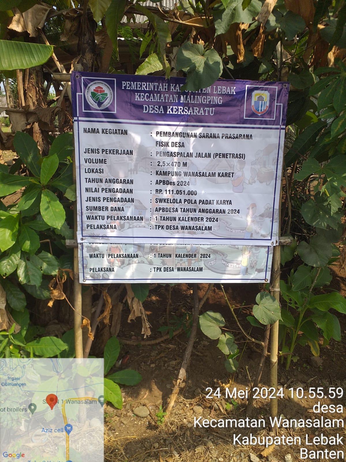 Liputanabn.com|| Lebak-Banten. Jum’at (24/05/2024) Proyek pengerjaan Lapisan Penetrasi (Lapen) Desa Wanasalam Kecamatan Wanasalam Kabupaten Lebak Banten dihebohkan dengan pemandangan Papan Informasi Publik (PIP) yang bukan merupakan nama Desa Wanasalam tetapi nama Desa Kersaratu Malingping,entah siapa yang patut disalahkan..??