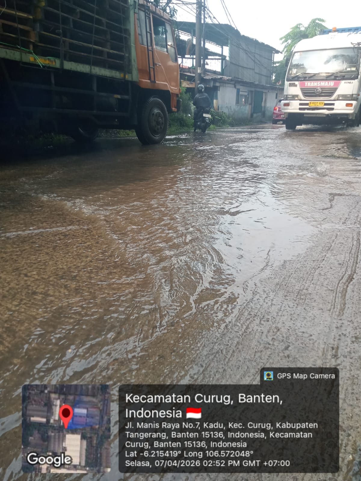 Liputanabn.com | Kabupaten Tangerang – Banjir kembali melanda Kadu, kawasan Pergudangan Manis, Kecamatan Curug, pada Selasa, 7 April 2026, sekitar pukul 14.56 WIB. Hujan dengan intensitas tinggi yang mengguyur wilayah tersebut sejak siang hari menyebabkan genangan air menutup akses jalan utama kawasan pergudangan.