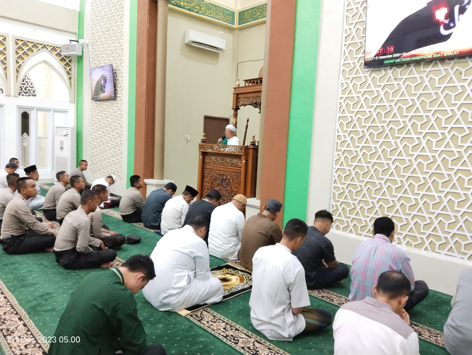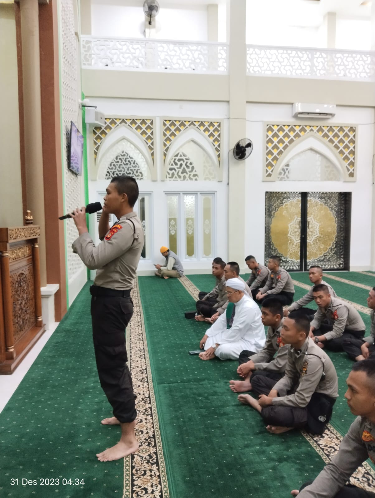 Liputanabn.com | Palembang – Belasan Personel Bintara remaja (Baja) Polda Sumsel yang mendapat tugas Yanma Polda Sumsel melaksanakan kegiatan pembinaan rohani dan mental (Binrohtal) di Masjid Al aman Komplek Pakri pada Ahad 31 Desember 2023 pagi