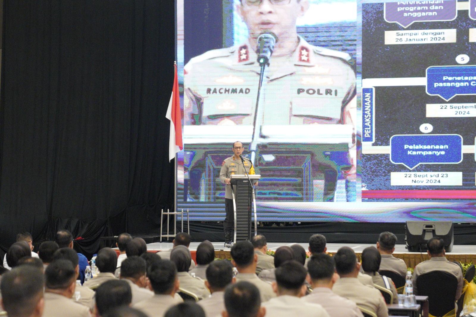 “Bersikap humanis dan jangan sekali kali melaksanakan kegiatan di luar dari tugas pengamanan Paslon. Seperti tidak ikut membantu menyebarkan pamflet, membagi bagikan sembako dan sejenisnya. Tetapkan fokus pada tugas sebagai pengawalan,” ujar alumni Akpol 1993 ini.
