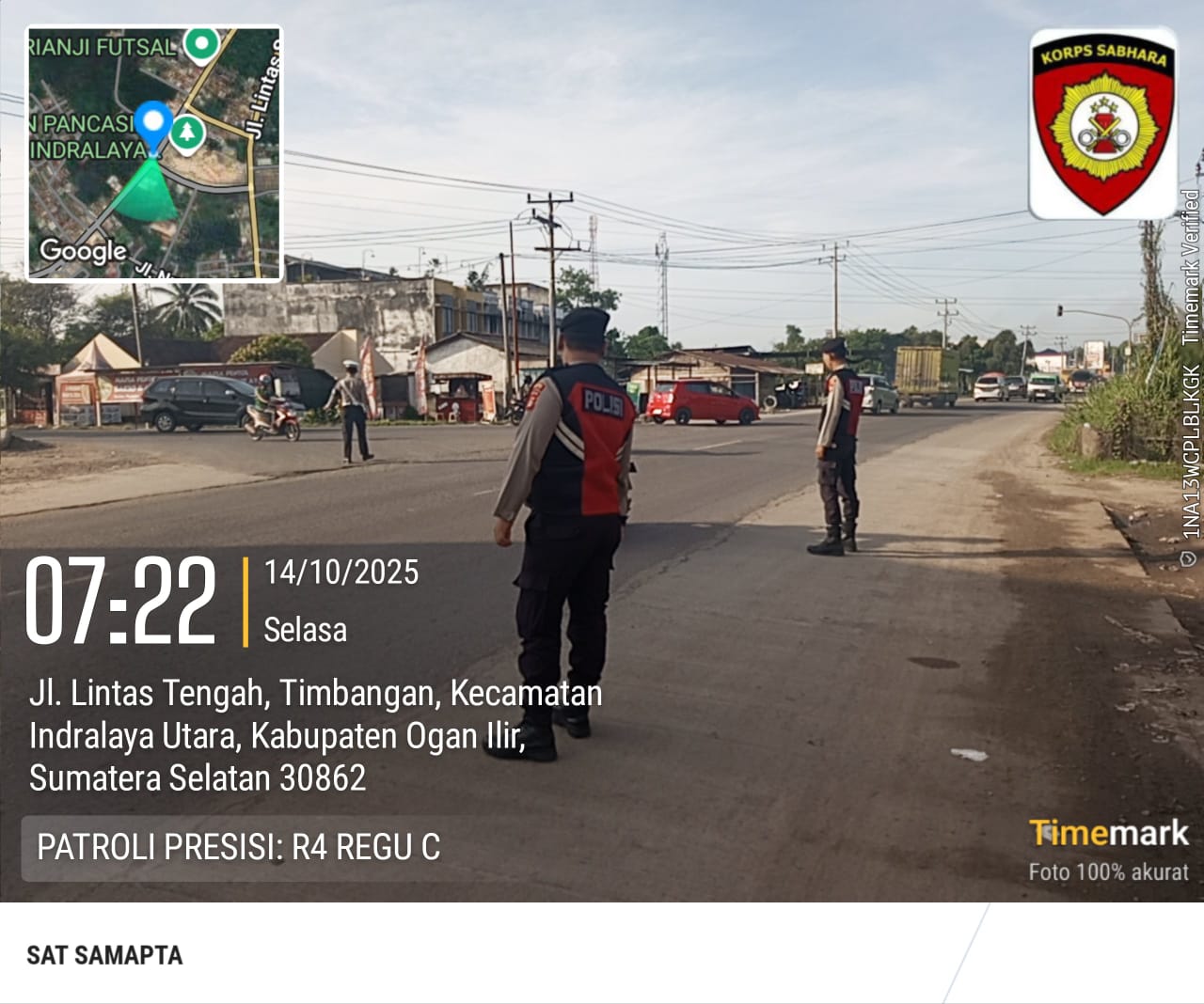 Liputanabn.com | Indralaya, 14 Oktober 2025 — Dalam rangka menciptakan situasi kamtibmas yang aman dan kondusif serta memberikan rasa aman bagi masyarakat pengguna jalan, Satuan Samapta Polres Ogan Ilir melaksanakan kegiatan Strong Point Pagi di sejumlah titik rawan kemacetan dan kecelakaan, Selasa (14/10/2025) sekira pukul 07.00 WIB.