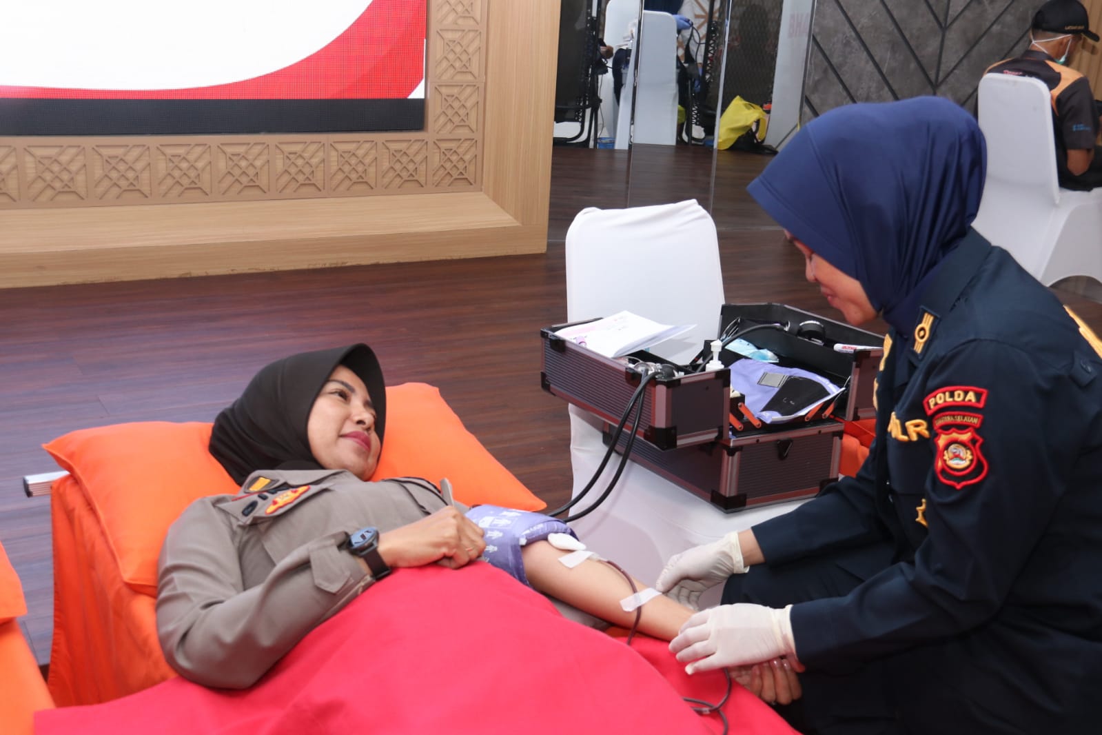 Donor darah berlangsung di Aula Wira Dharma Cendekia Rumah Sakit Bhayangkara M.Hasan Palembang Jumat, 16 Agustus 2024.