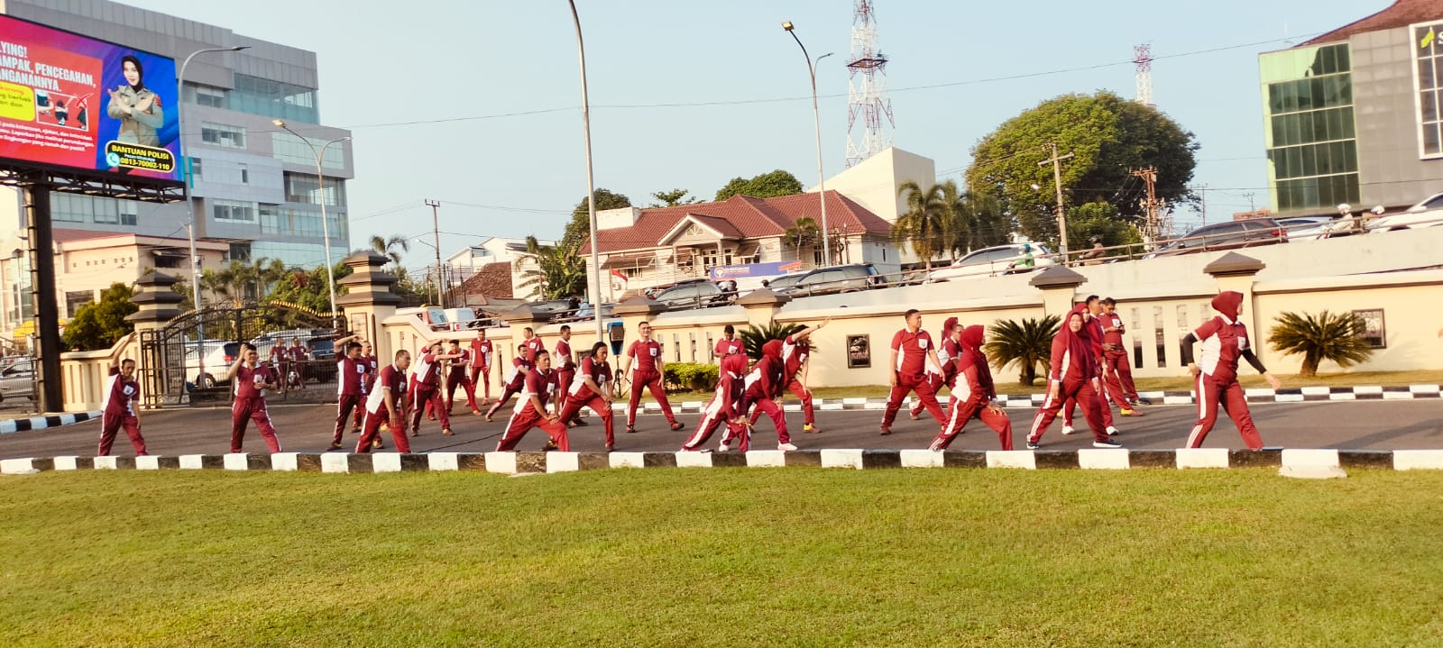 Setelah pelaksanaan apel pagi, seluruh personel melaksanakan senam pagi bersama di Mako Polda Sumsel