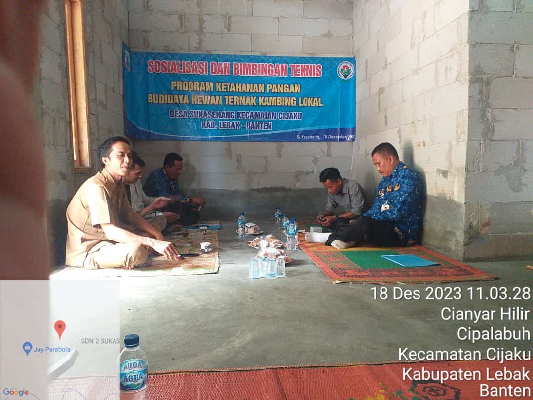 Salah satunya Desa Sukasenang Kecamatan Cijaku Kabupaten Lebak-Banten Gelar Sosialisasi Dan Bimbingan Teknis Program Ketahanan Pangan Budidaya Hewan Ternak Kambing Lokal untuk memberikan penyuluhan kepada calon Kelompok Penerima Manfaat agar program Ketahanan Pangan Desa Sukasenang yang Dialokasikan kepada pembelian hewan ternak kambing lokal agar dipelihara dengan baik.
