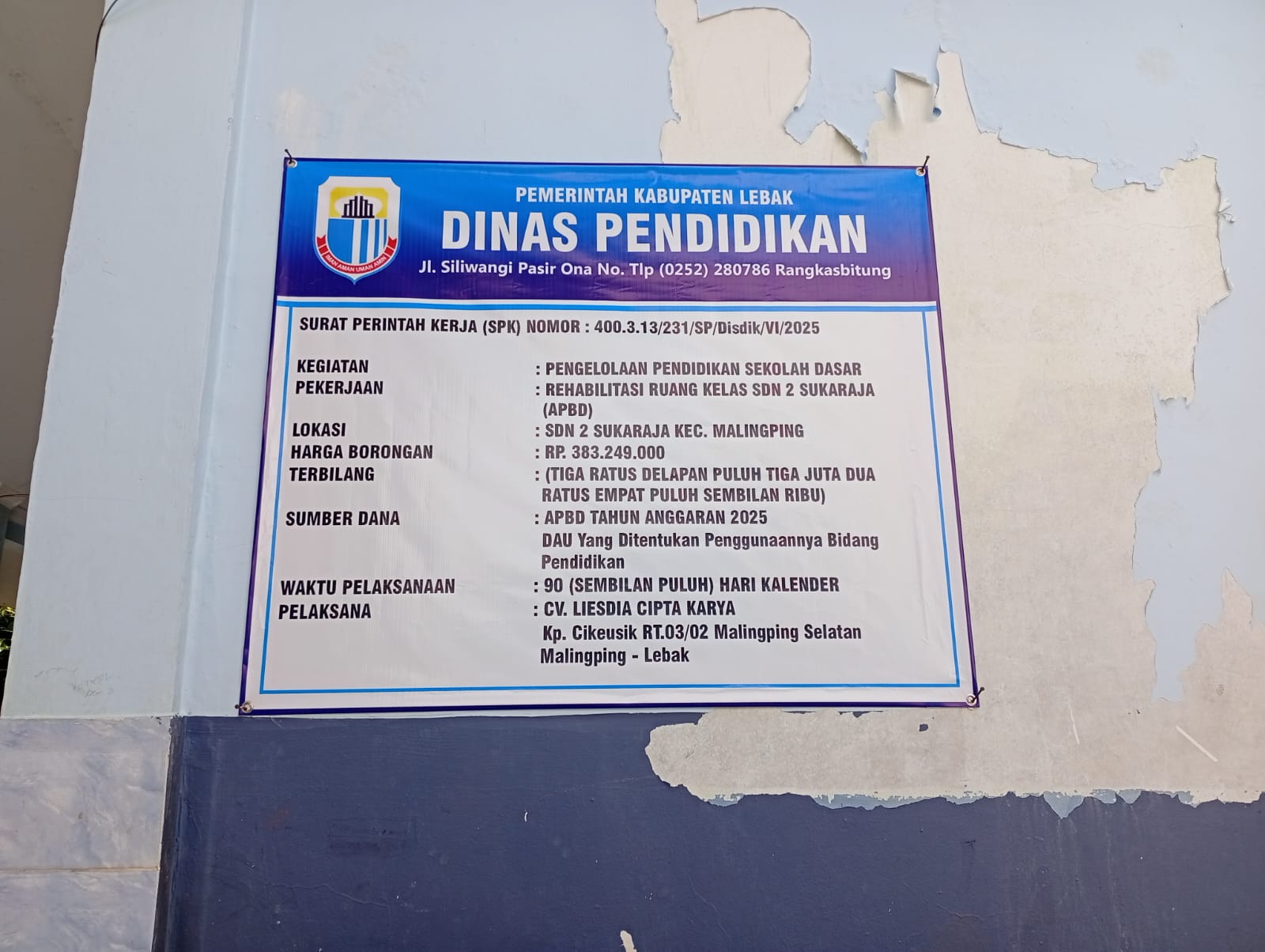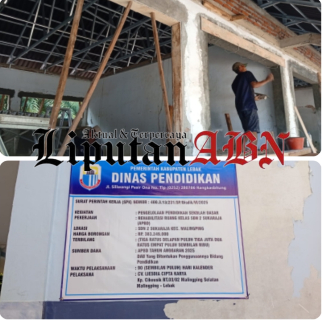 Liputanabn.com | Lebak Banten – Pekerja proyek Rehab ruang sekolah SDN 2 Sukaraja Kecamatan Malingping kab. Lebak ini tanpa di lengkapi K3 , Pengerjaan proyek dana dari APBD Tahun Anggaran 2025 dengan nilai anggaran Rp 383.249.000,dikerjakan oleh CV. LIESDIA CIPTA KARYA Kampung Cikeusik RT.03/02 Malingping Selatan, dengan waktu 90 hari kerja kalender.