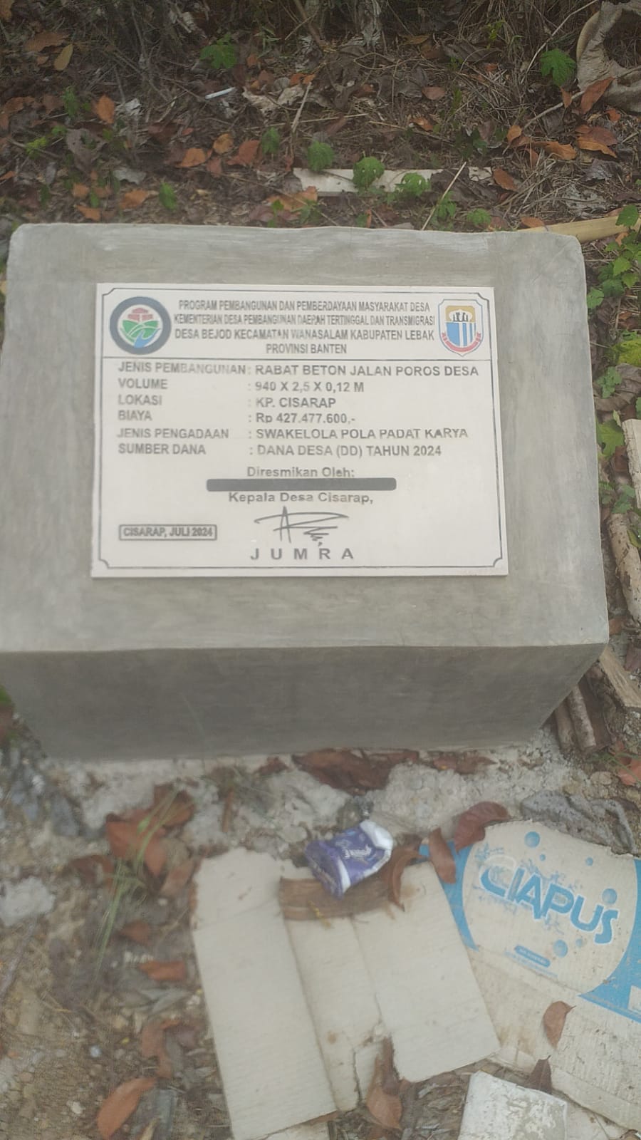 Liputanabn.com || Lebak-Banten. Rabu (02/10/2024) Dana Desa merupakan anggaran yang diberikan oleh pemerintah pusat untuk dipergunakan sebaik mungkin serta tepat sasaran terkadang dijadikan kesempatan oleh oknum pemerintah Desa untuk mencari keuntungan dari proyek yang dibiayai oleh Dana Desa dengan cara menggelembungkan anggaran dan atau mengurangi bahan material sehingga berdampak kepada kwalitas bangunan,seperti proyek rabat beton di Kp.Cisarap Desa.Cisarap Kecamatan.Wanasalam Kabupaten.Lebak-Banten yang memakan Anggaran Rp.427.477.600 dengan Volume 940×2,5×0,12 M APBDes Tahun 2024 baru beberapa minggu selesai dikerjakan sudah rusak dan terbelah diduga ada oknum yang sengaja mengurangi bahan material sehingga terkesan asal jadi.