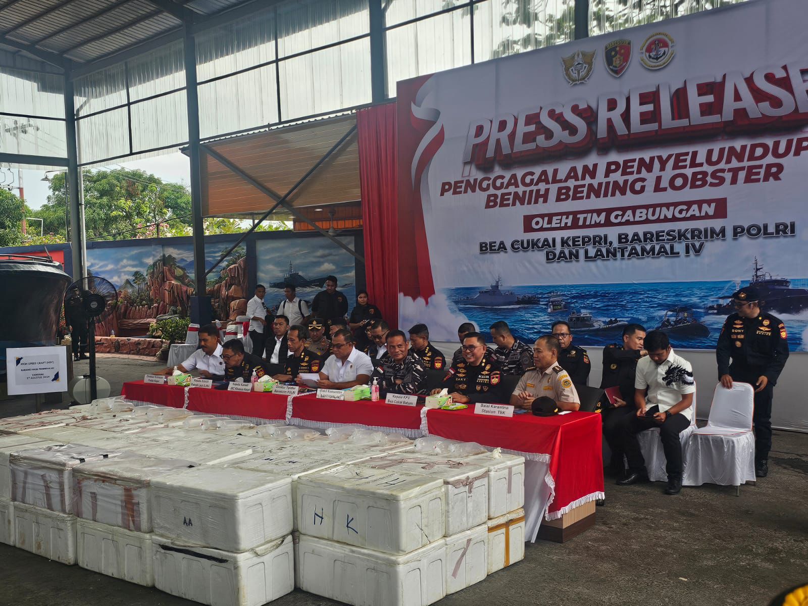 Liputanabn.com | Batam – Tim Gabungan Bareskrim Polri bersama Kanwilsus DJBC Kepri, dan Lantamal IV Batam berhasil menggagalkan upaya penyelundupan benih bening lobster yang yang terjadi di Perairan Berakit, Kabupaten Bintan, Kepulauan Riau. Hal ini disampaikan oleh Dirtipidter Bareskrim Polri Brigjen Pol Nunung Syaifuddin, S.I.K., M.M., didampingi Kakanwil DJBC khusus Kepri Adhang Noegroho Adhi, pada saat konferensi Pers di Kantor DJBC Khusus Kepri Kabupaten Karimun. Kamis (17/10/2024).