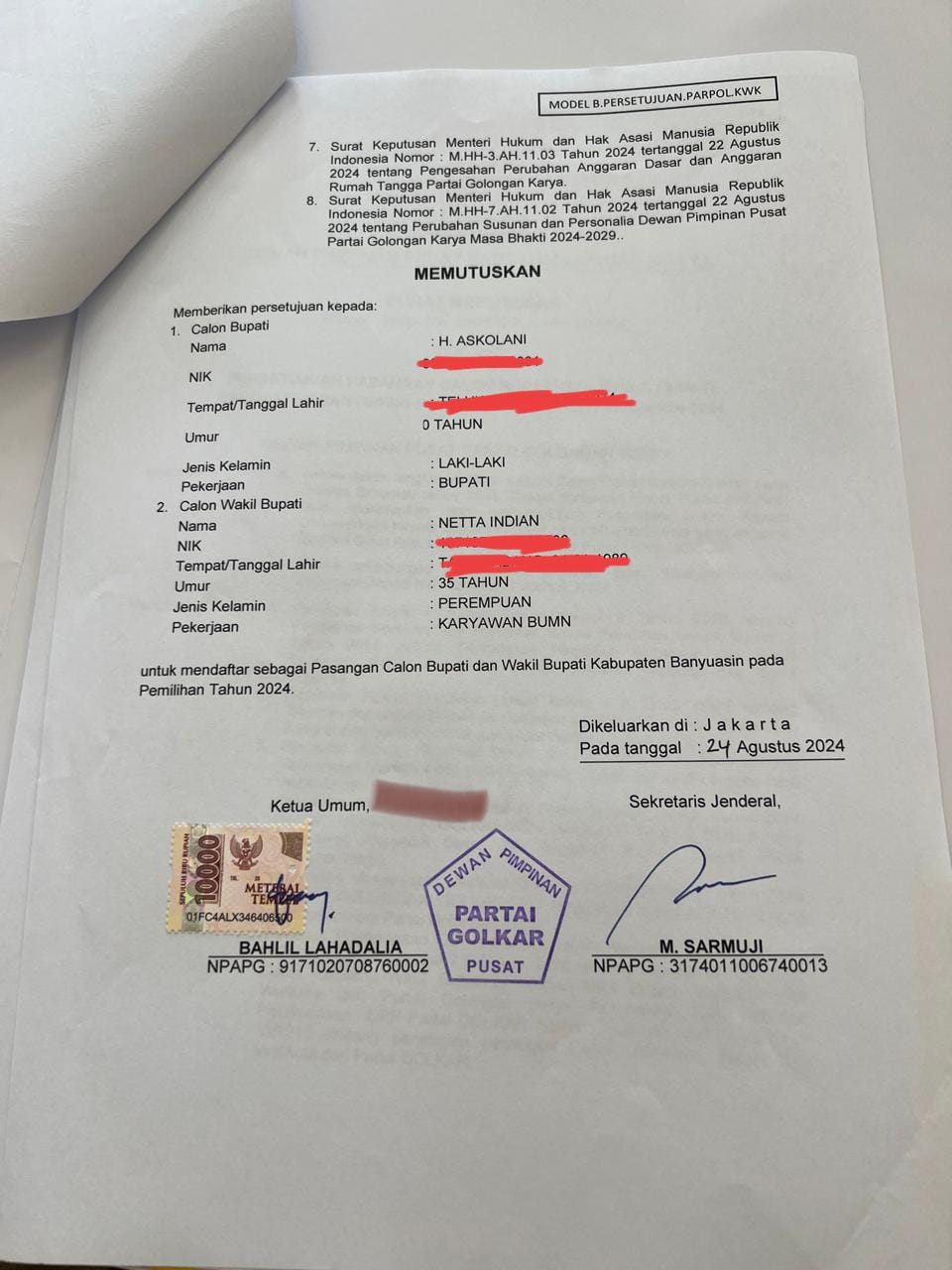 Form model B1 persetujuan Partai politik ini menjadi jawaban bagi semua pihak terkait isu dukungan Partai Golkar di Pilkada Banyuasin yang bakal digelar 27 November 2024 nanti.
