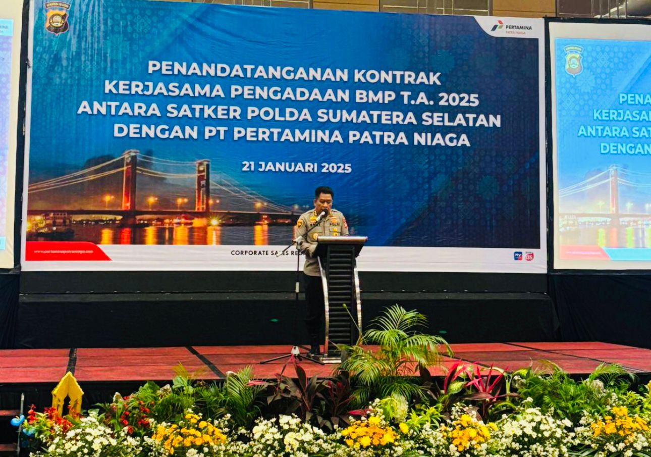 Penanda tanganan kerjasama antara Polda Sumsel dengan PT Pertamina Patra Niaga dalam rangka pengadaan Bahan Bakar Minyak & Pelumas (BMP) tahun 2025 dijajaran Polda Sumatera Selatan.