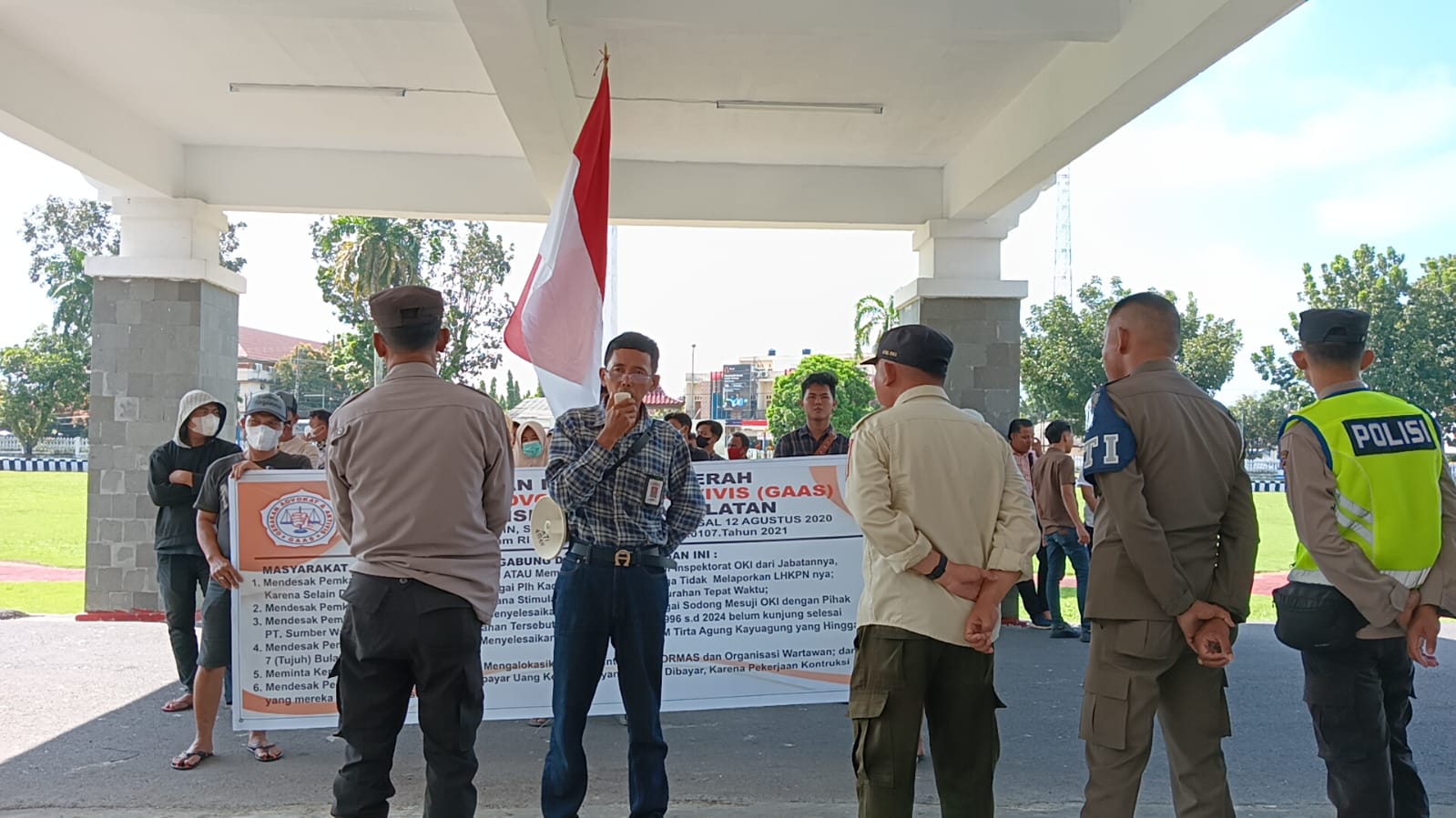 Koordinator Aksi DPD GAAS Sumsel, Aliaman SH didampingi Koordinator Lapangan, Yasin saat menyampaikan orasinya menegaskan dan mendesak agar, Pemkab OKI segera Mengevaluasi ATAU Memecat Oknum Inspektur Inspektorat OKI dari Jabatannya, karena selain diduga rangkap jabatan sebagai Plh Kadin Pendidikan OKI, Oknum Inspektur Inspektorat OKI (Syafaruddin) Diduga Tidak Melaporkan LHKPN nya;