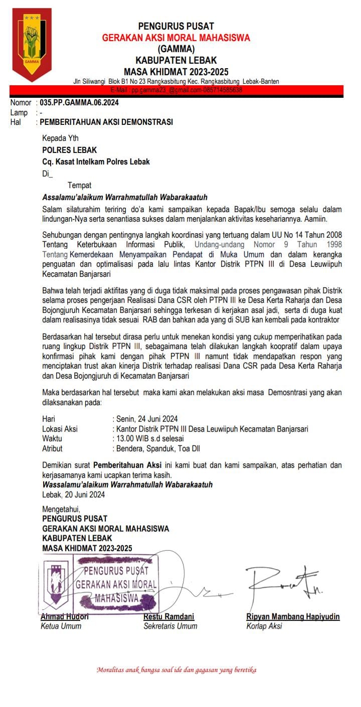 Liputanabn.com ||Lebak-Banten. Minggu (23/06/2024) Selembaran Aksi yang tergabung dalam Gerakan Aksi Moral Mahasiswa (GAMA), di salah Satu Perusahaan BUMN yang membidangi Perkebunan Kelapa Sawit (PKS) di Distrik PTPN III, Desa Lewi Ipuh Kecamatan Banjarsari Lebak Banten.