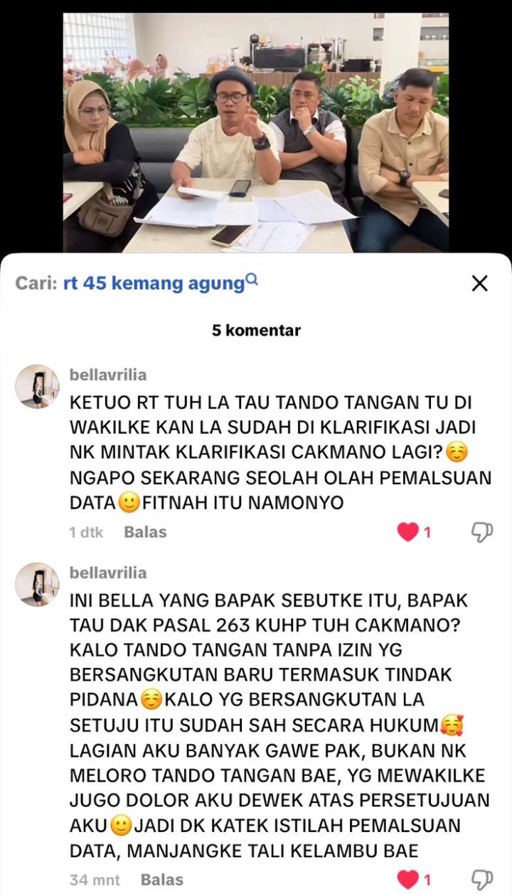 Di sisi lain, salah satu warga yang tidak ingin disebutkan namanya (BA) merasa heran dengan pernyataan lawyer didampingi Ketua RT 45 tersebut. Ia menegaskan bahwa data aspirasi warga yang disampaikan adalah asli dan tidak dipalsukan.