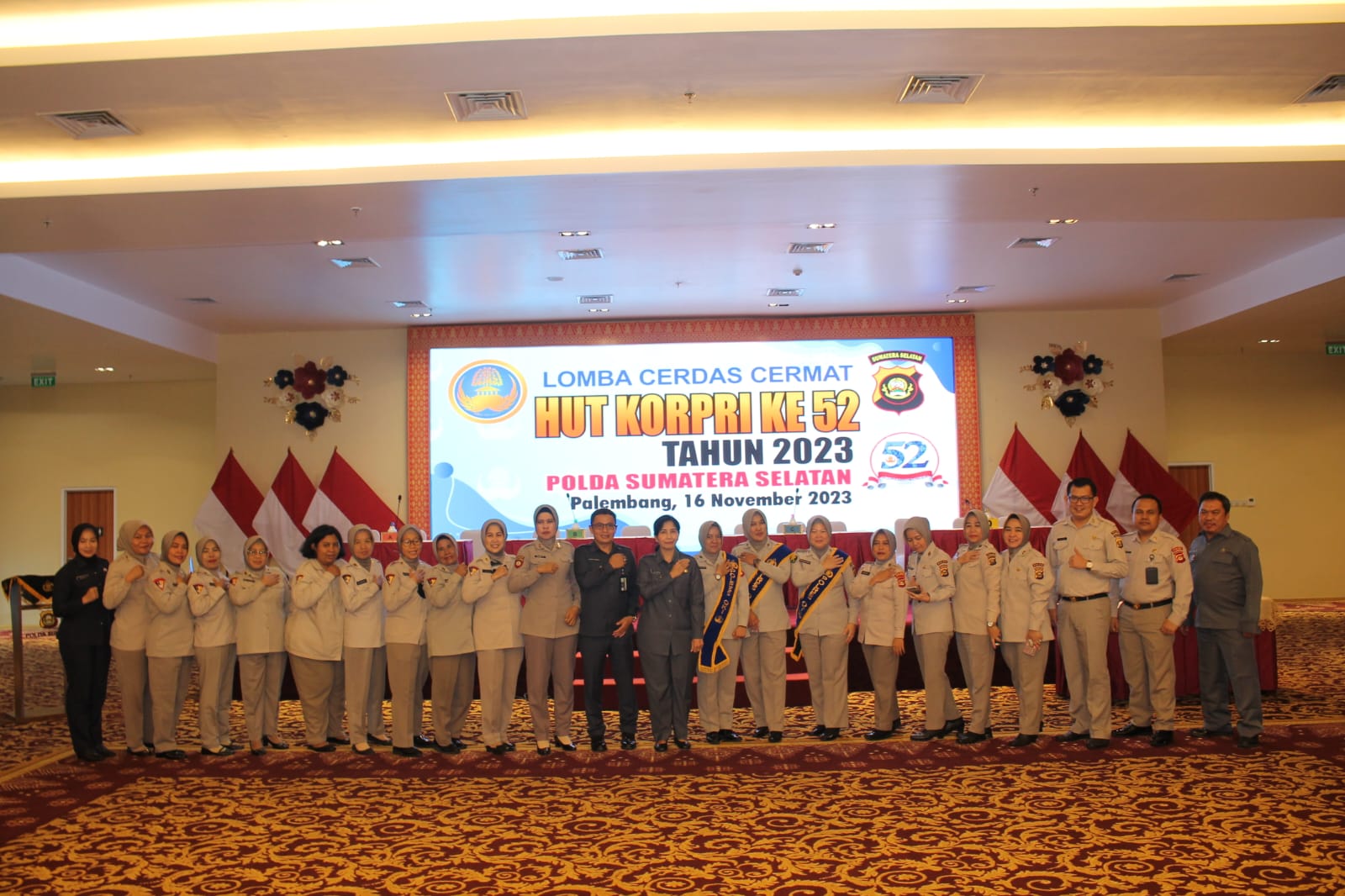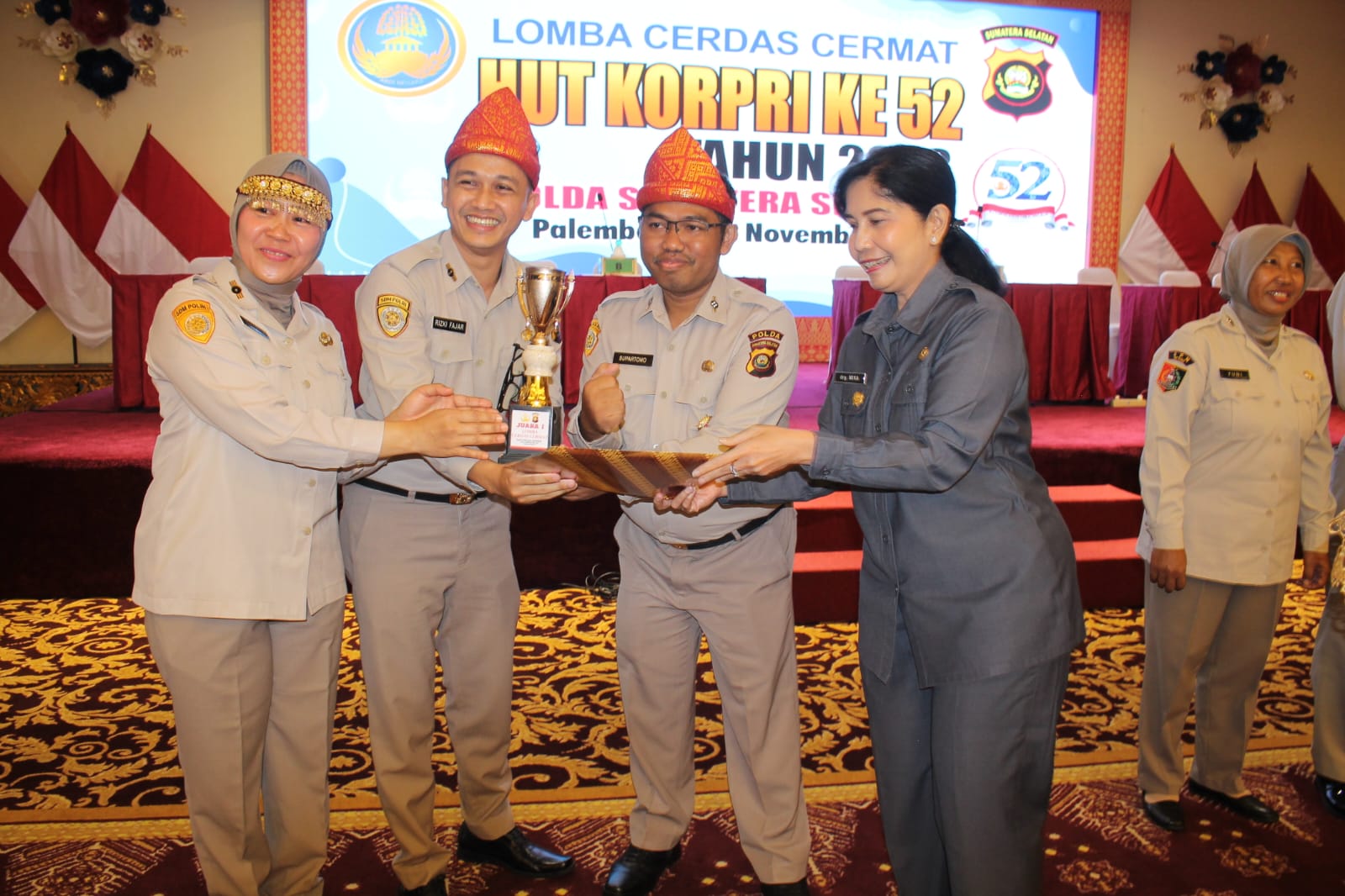 adapun pemenang pada lomba cerdas cermat HUT Korpri ke-52.Polda Sumsel pemenang pertama PNS Satker Biro SDM Polda Sumsel Pemenang kedua PNS Satker SPN Polda Sumsel Pemenang ketiga PNS Satker Setum Polda Sumsel sedangkan harapan pertama PNS Satwil Polres Musi Rawas kedua PNS Satwil Polres OKU dan ketiga Satker Yanma Polda Sumsel