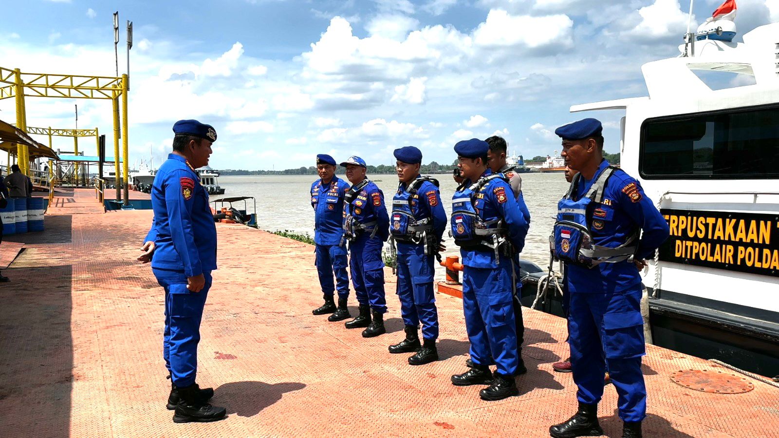 Direktur Polairud Polda Sumsel Kombes Andreas Kusmaedi saat memberikan instruksi kepada awak kapal Sei Rawas menekankan pentingnya misi yang akan dijalankan dengan memberikan pelayanan maksimal kepada masyarakat yamgembutuhkan bantuan kepolisian.