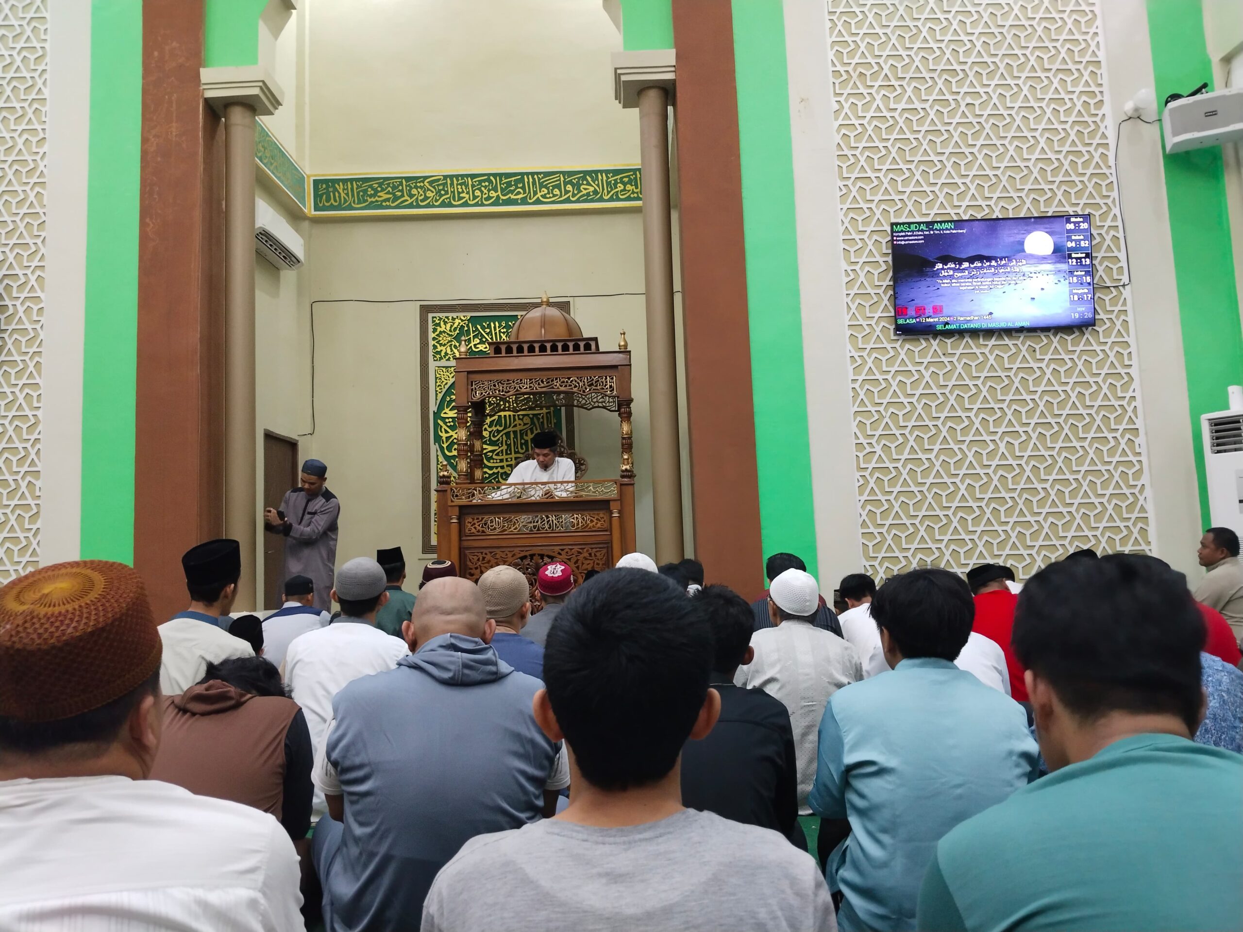 Salah satu ibadah yang wajib dilakukan oleh umat Islam pada bulan ini adalah berpuasa. Ketika berpuasa, muslim diwajibkan untuk menahan lapar dan haus dari matahari terbit hingga terbenam ucap H Darul dalam kegiatan Tausiyah sholat tarawih dan witir dimasjid Al-Aman Komplek Pakri Jalan Jenderal Bambang Utoyo Palembang Selasa 12 Maret 2024 malam