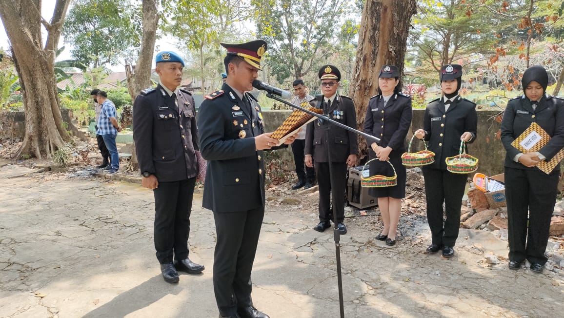 Dalam melaksanakan upacara pemakaman Selaku Inspektur Upacara, Wakapolres Banyuasin Kompol Adriansyah,SH SIK , yang dihadiri Kabag SDM Kompol Yuzar Heriz,SIP ,MSi