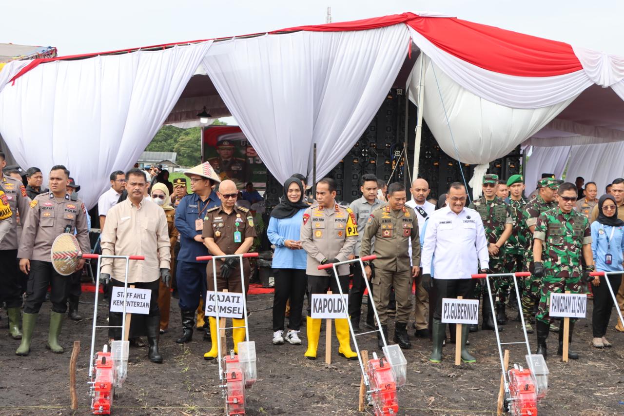 Kapolda Sumatera Selatan Irjen Pol Andi Rian R. Djajadi bersama PJ Gubernur Sumsel diwakili Sekda Edward Chandra, Pangdam II/Sriwijaya Mayjen TNI Muhammad Naudi Nurdika SIP beserta Forkompimda Sumsel dan Forkompimda Kabupaten Ogan Ilir turun langsung dalam program penanaman jagung serentak 1 juta hektar.