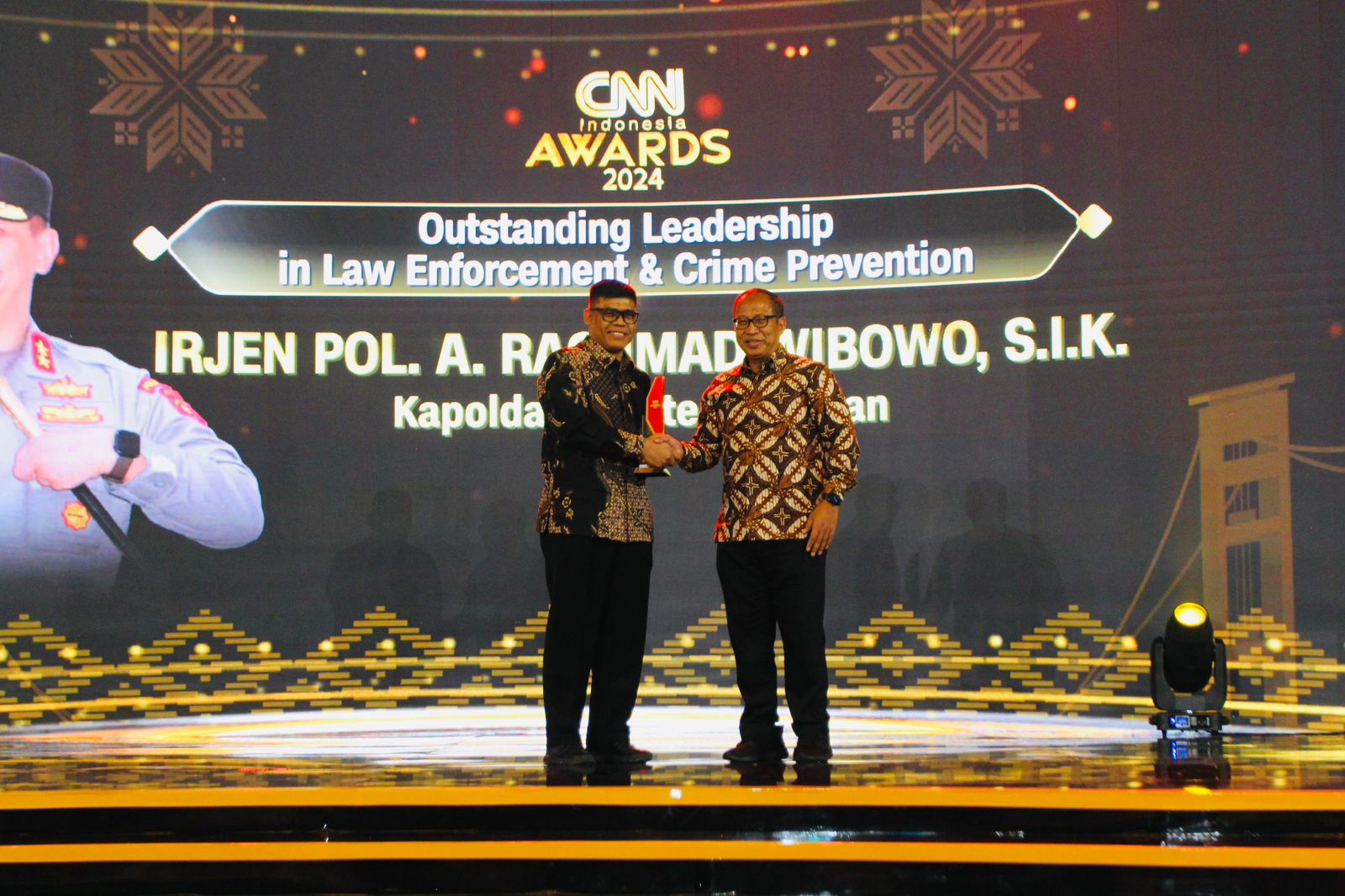 Liputanabn.com | PALEMBANG – Kapolda Sumsel Irjen A Rachmad Wibowo meraih penghargaan khusus ‘Outstanding Leadersehip in Law Enforcement and Crime Prevention’ dalam ajang penghargaan CNN Indonesia Awards 2024 yang digelar disalah satu hotel ternama di Palembang, Sumatra Selatan, Rabu malam (10/7/2024).