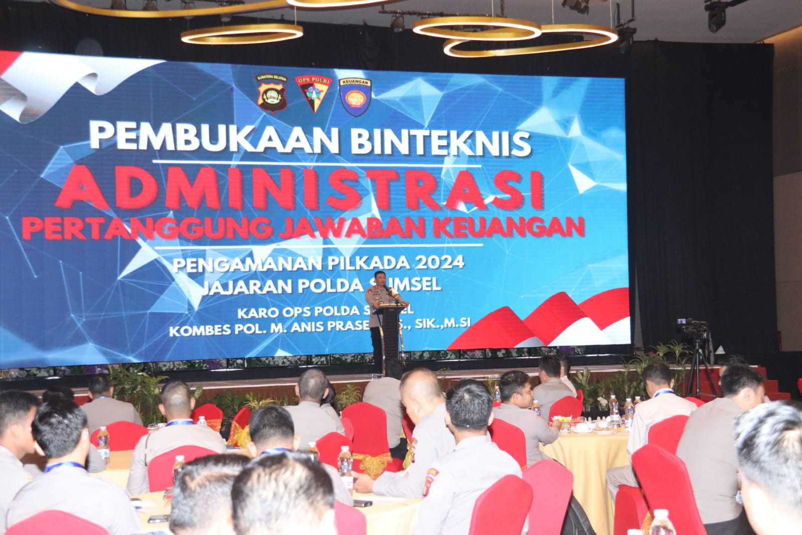 Liputanabn.com | Palembang – Kapolda Sumsel Irjen Pol A.Rachmad Wibowo,SIK diwakili Karo OPS Polda Sumsel Kombes Pol Anis Prasetio Santoso,SIK,SH membuka Binteknis Administrasi Pertanggung jawaban Keuangan Pengamanan Pilkada 2024 Jajaran Polda Sumsel di ballroom Hotel The Zuri Palembang Rabu 28/08/2024 pagi