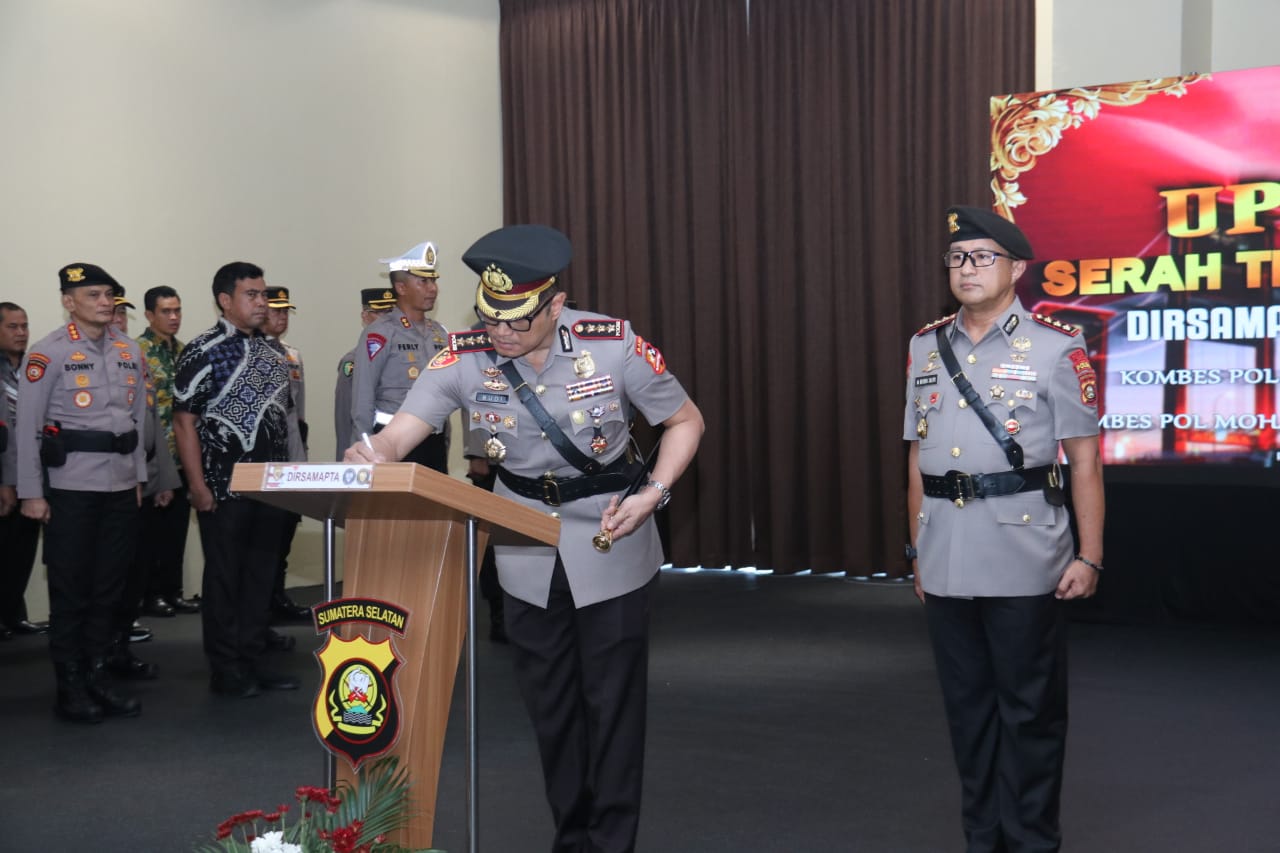 Liputanabn.com | Palembang – Kapolda Sumsel Irjen Pol A.Rachmad Wibowo ,SIK memimpin upacara serah terima Jabatan (sertijab) Dirsamapta Polda Sumsel yang meliputi pengambilan sumpah jabatan, pelantikan, dan penandatanganan berita acara.