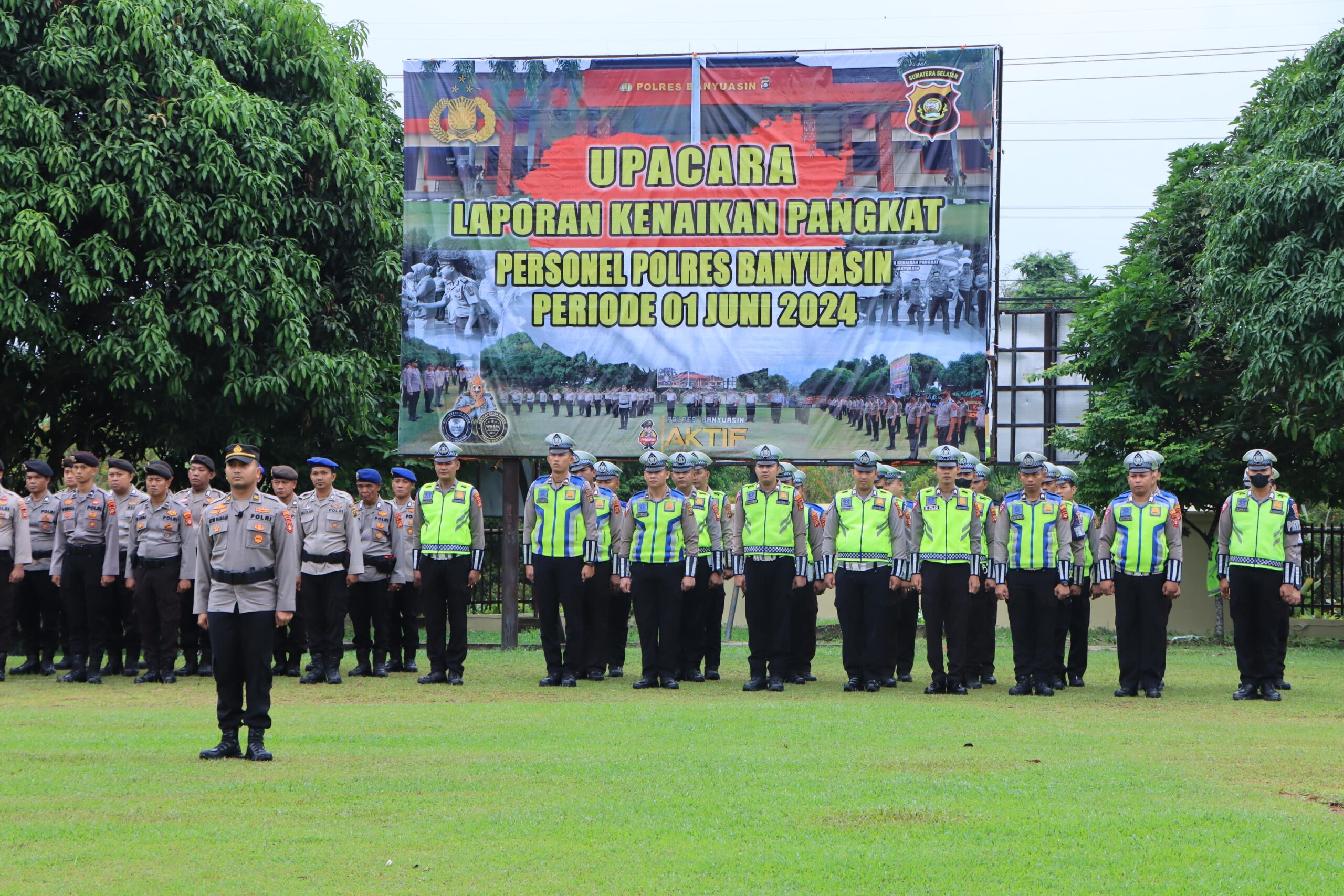 Upacara yang di hadiri oleh seluruh personil Polres Banyuasin termasuk Para Pejabat Utama (PJU) dan ASN serta personil yang mendapat kenaikan pangkat pengabdian Kompol Manjalo Harianja SH, Ipda Ahmad Sayuti dan Penata TK I Widyawati SKM MM.