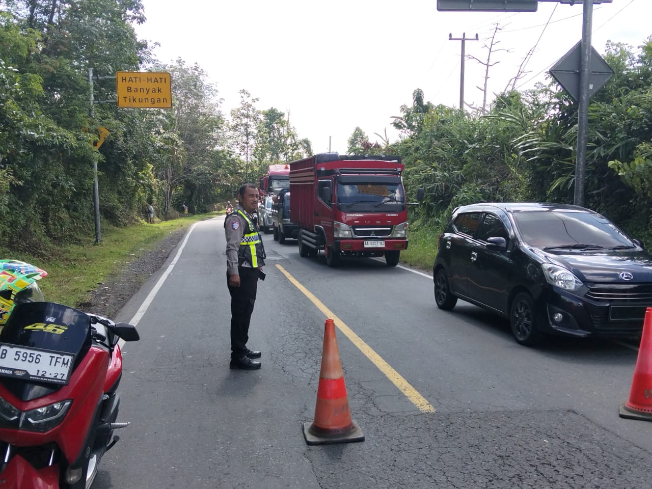 Di sisi lain, pengaturan lalu lintas dilakukan secara prioritas dengan memberikan akses utama bagi kendaraan darurat seperti ambulans. Personel di lapangan juga memastikan arus kendaraan tetap bergerak secara bertahap sehingga tidak terjadi gangguan berkepanjangan.