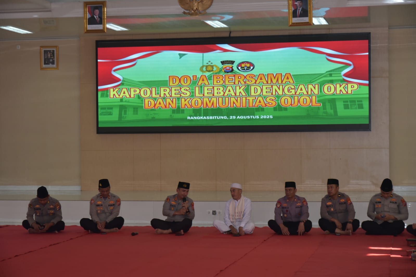 Liputanabn.com | Lebak – Dalam rangka mendo’akan almarhum Driver Ojol, Affan Kurniawan, Kapolres Lebak Polda Banten AKBP Herfio Zaki, S.I.K., M.H. bersama Organisasi Kemasyarakatan Pemuda (OKP) Lebak dan Komunitas Ojek Online (Ojol) Lebak menggelar do’a bersama di Aula Sanika Satyawada Polres Lebak, Jumat (29/8/2025).