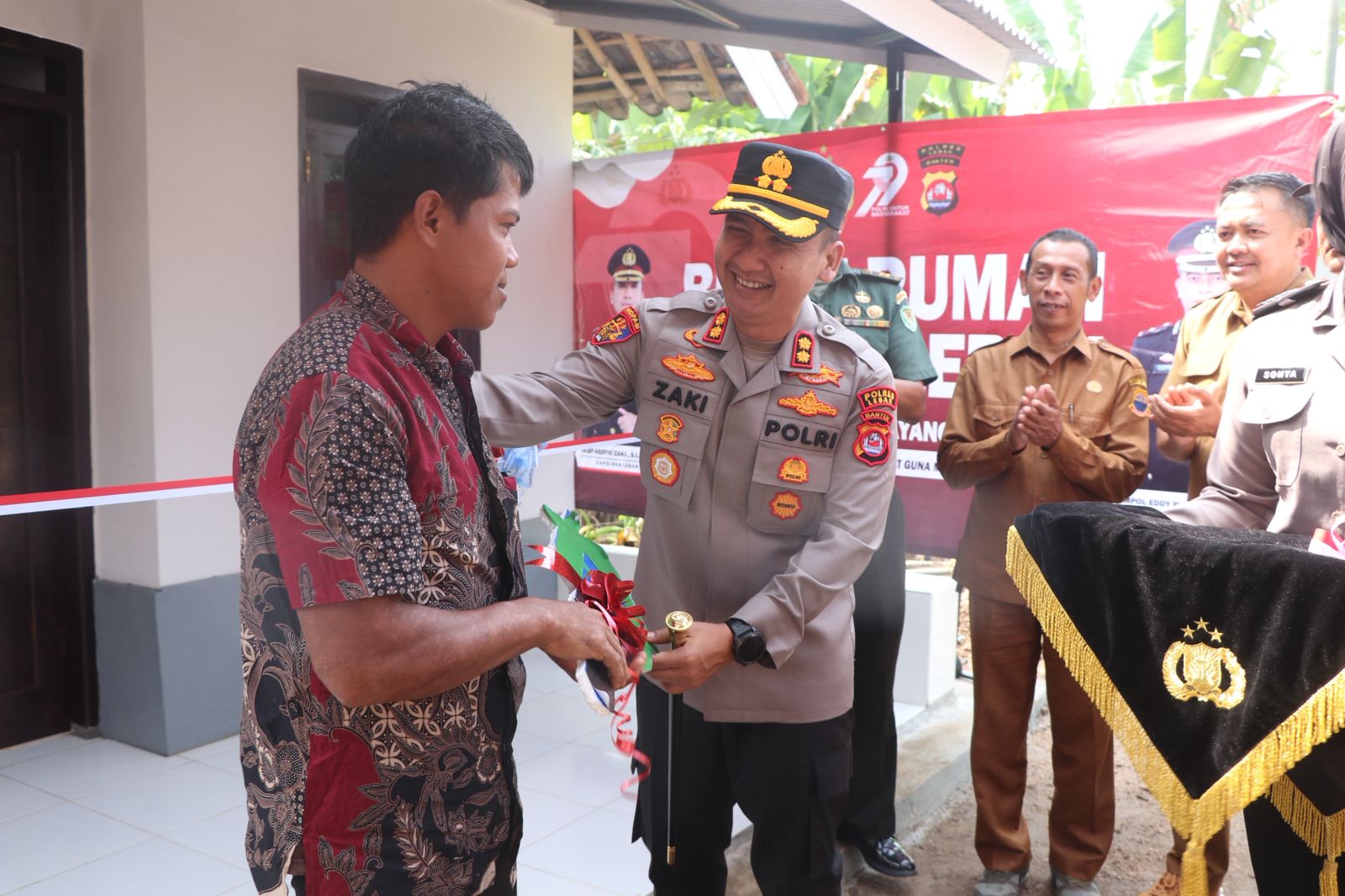 Dalam peresmian sekaligus pengguntingan pita sebagai simbol serah terima rumah pada pukul 10.30 WIB., acara berlangsung dengan penuh kehangatan dan rasa kebersamaan. Disamping bedah rumah kita juga memberikan bantuan sosial berupa sembako. Tengunya Ini adalah wujud nyata kepedulian Polri kepada masyarakat. Melalui momen HUT Bhayangkara ke-79, kami ingin menunjukkan bahwa Polri selalu hadir untuk masyarakat, tidak hanya dalam hal keamanan, tetapi juga dalam kegiatan sosial dan kemanusiaan,” ujar Kapolres Lebak.