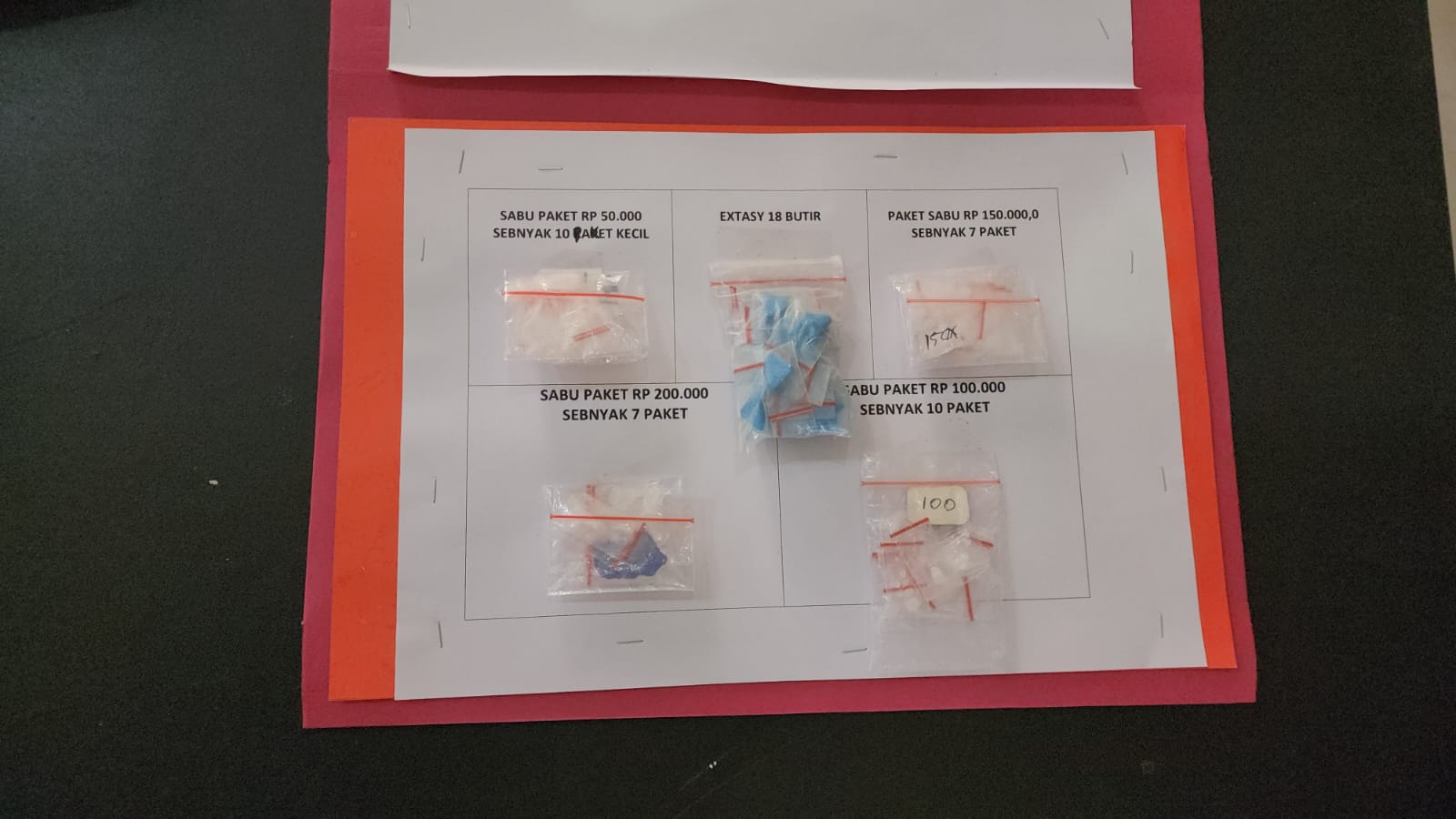 Dari tangan tersangka anggota mengamankan BB diantaranya, berupa satu buah tas genggam warna hitam, satu buah dompet berwarna merah bermerek toko emas metro dengan uang tunai Rp 310.000, 4 bungkus plastik klip sedang yang berisikan 34 bungkus plastik klip kecil yang berisikan kristal Putih diduga narkotika jenis sabu dengan seberat 6,70 gram, satu bungkus plastik kecil sedang yang berisikan 18 butir pil berwarna biru dengan logo tengkorak yang diduga narkotika jenis ekstasi seberat 9,62 gram.