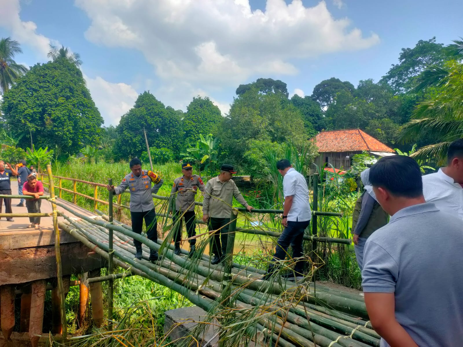 Di lokasi, terlihat sinergi antara masyarakat dan aparat kepolisian yang tengah bergotong royong membangun jembatan darurat dari bambu sebagai akses sementara bagi warga.