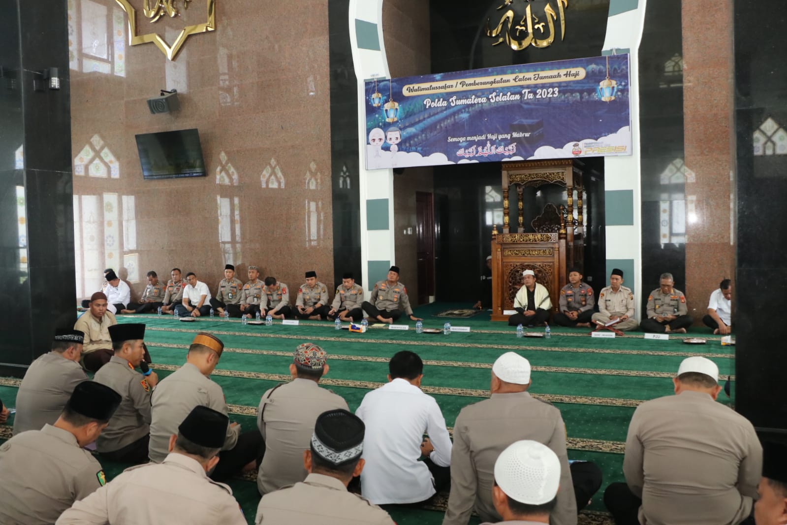 Karo SDM Polda Sumsel Melepas 40 Jamaah Haji Polda Sumsel di Masjid Assaadah Mapolda Sumsel