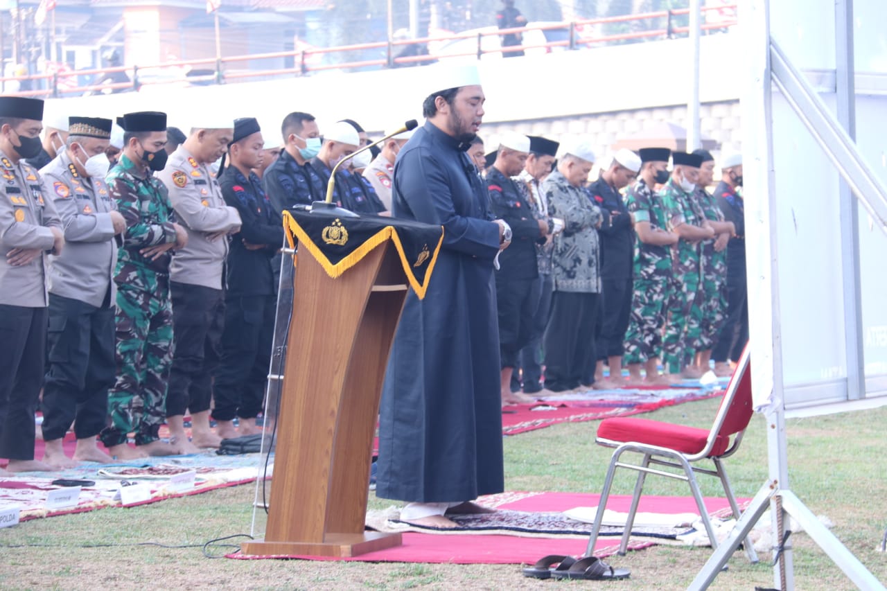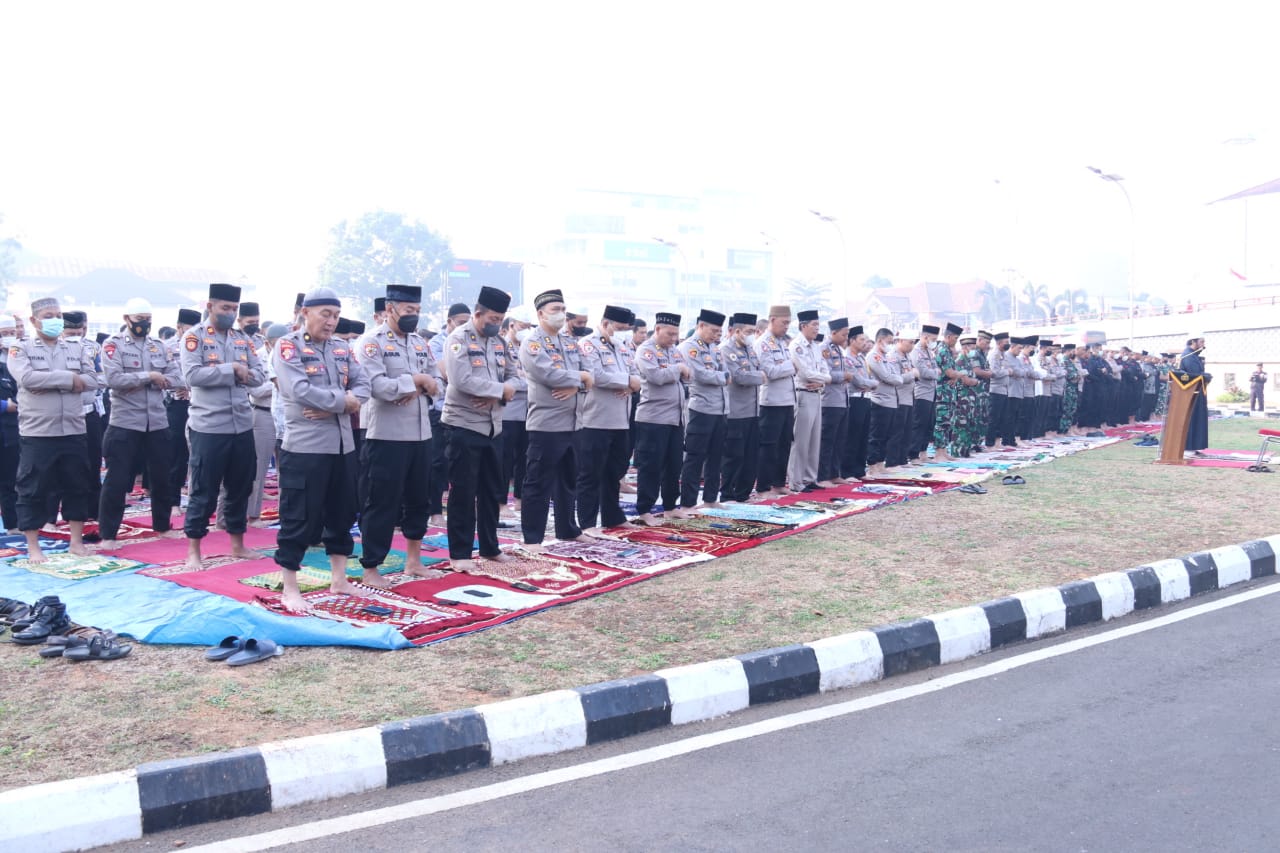 Sementara H .Bagus Setiawan,LC M.E sebagai khotib dan imam memimpin pelaksanaan salat Istisqa di Mapolda Sumsel
