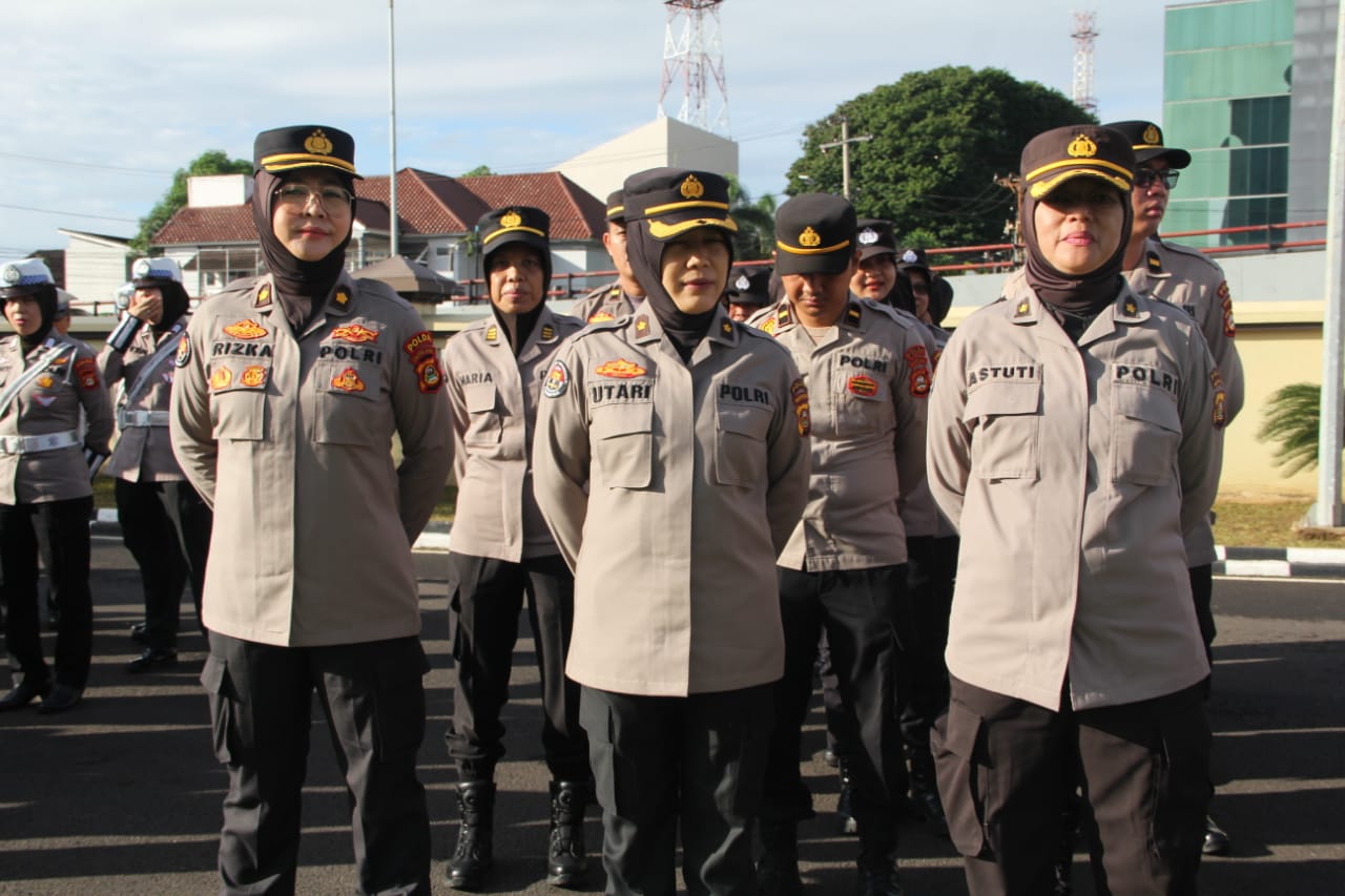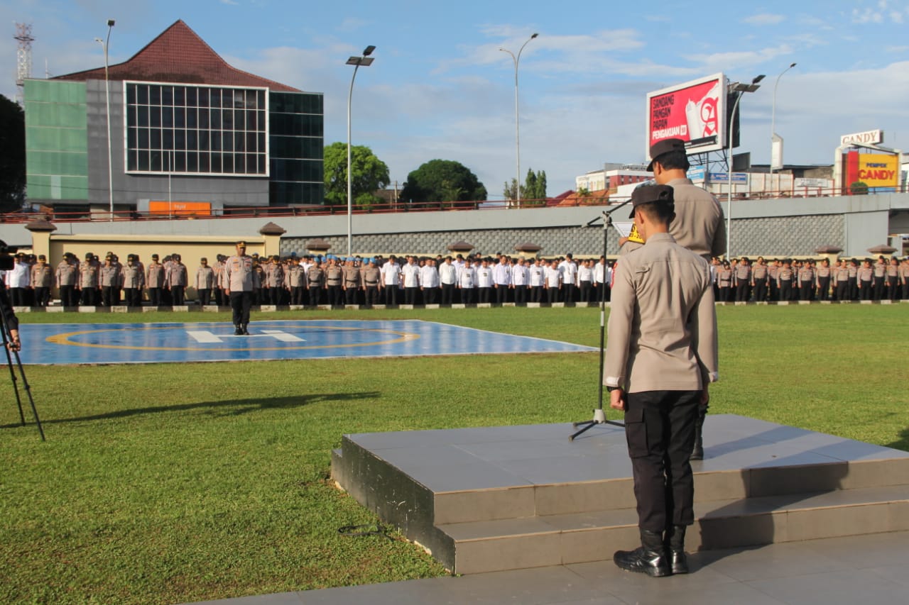 ,SH ,SIk diikuti PJU dan Personel Polda Sumsel dihalaman Gedung utama Presisi Mapolda Sumsel Jalan Jenderal Sudirman KM 4 Palembang Rabu 14 Februari 2024.