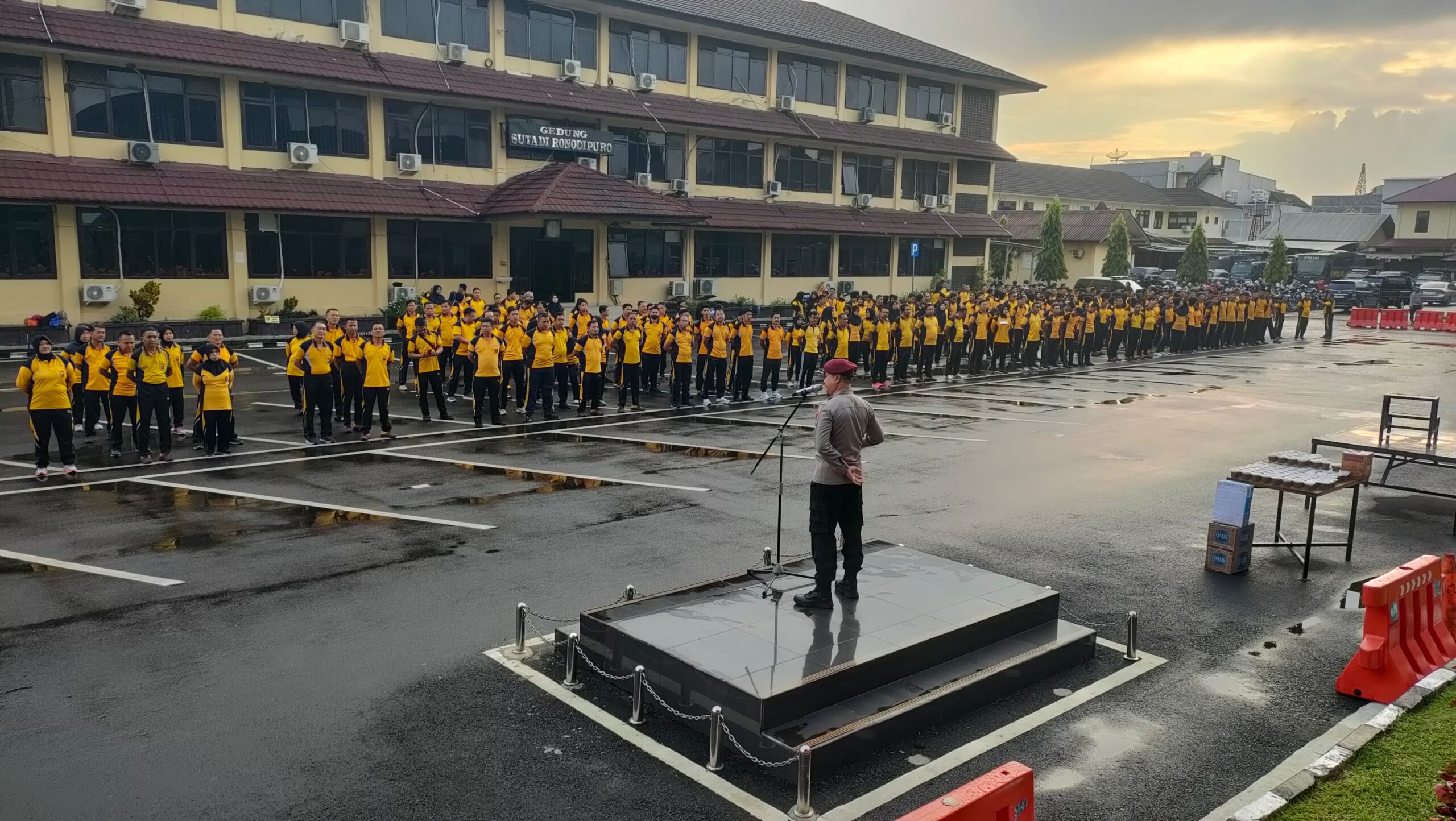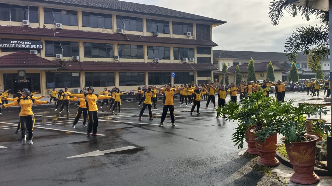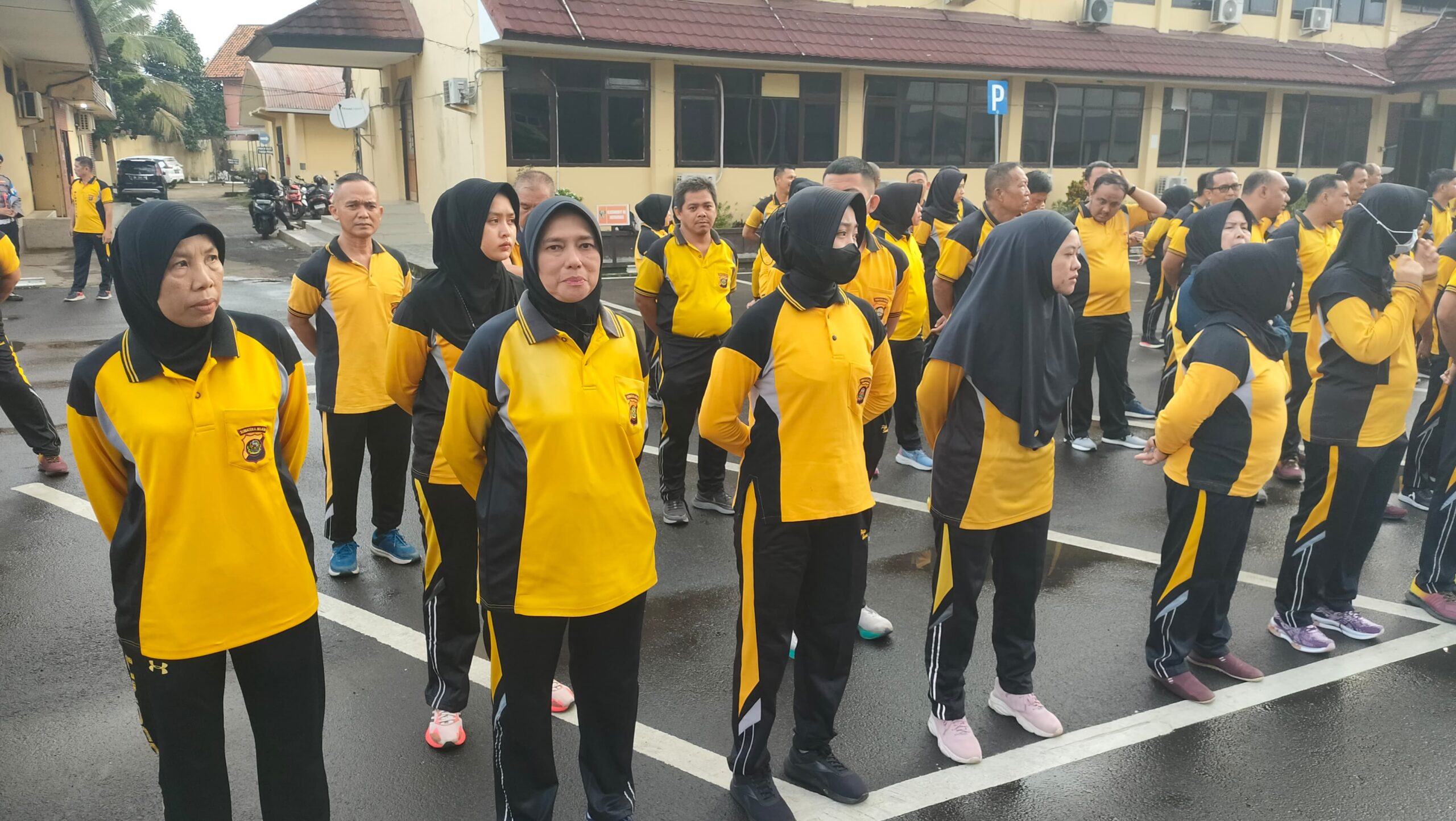 Kegiatan olahraga pagi yang diawali dengan pemanasan kemudian dilanjutkan dengan senam bersama PNS dan Polri yang di pimpin oleh Instruktur Senam bertempat di lapangan Apel Mapolda Sumsel
