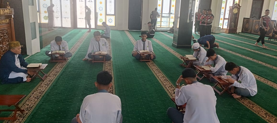 Suasana khusyuk tampak menyelimuti Masjid Assa’adah Mapolda Sumsel setiap hari jelang waktu Dhuha hingga sholat ashar. Lantunan ayat suci Alquran bergema indah dibacakan secara bergantian oleh para pelajar SMA Muhammadiyah 2 Palembang bersama personel Polri satker Polda Sumsel, Kegiatan tadarus bersama ini menjadi agenda rutin yang dijalankan untuk memakmurkan masjid sekaligus mengisi waktu dengan kegiatan positif di bulan penuh ampunan.