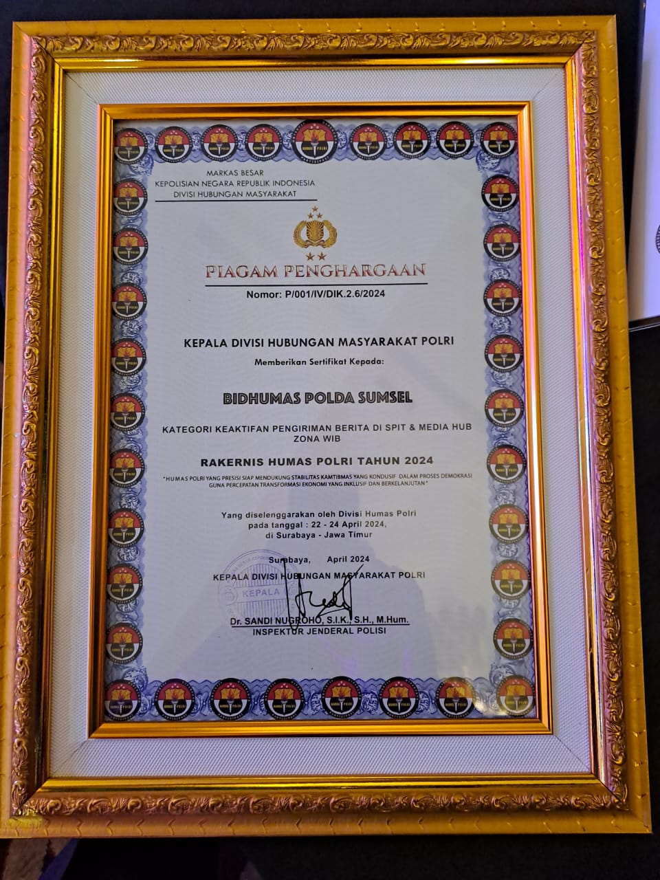 Saat diminta keterangan Kabid Humas Polda Sumsel Kombes Sunarto menuturkan, piagam penghargaan yang diterima olehnya. Diharapkan menjadi motivasi seluruh personel Humas baik yang ada di Polda Sumsel maupun yang jajaran Polres.