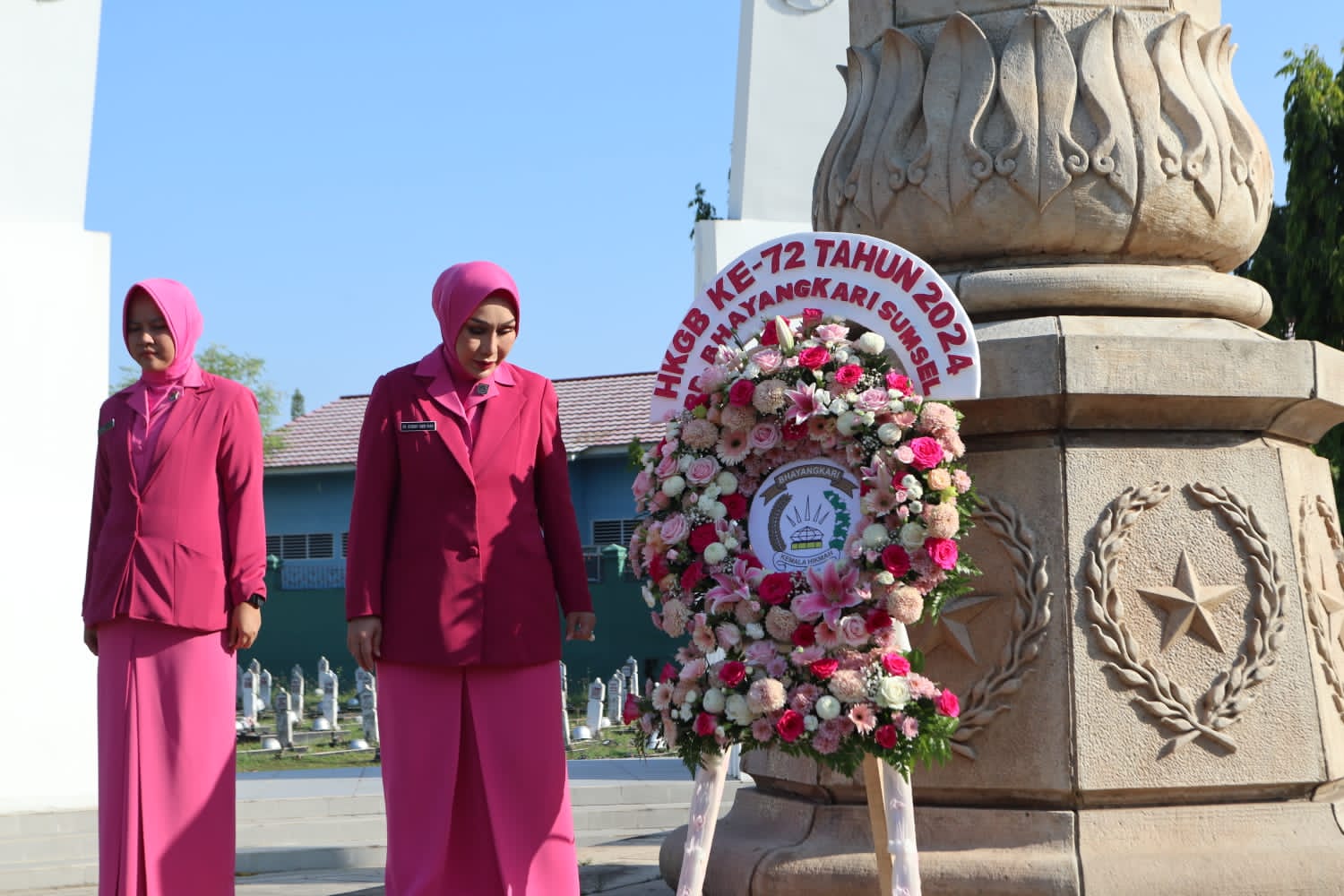 Ketua Pengurus Daerah Bhayangkari Sumsel Ny.Dewwy Andi Rian menyampaikan bahwa, ziarah dan tabur bunga di Taman Makam Pahlawan merupakan rangkaian untuk memperingati Hari Kesatuan Gerak Bhayangkari (HKGB) Ke 72 tahun 2024.