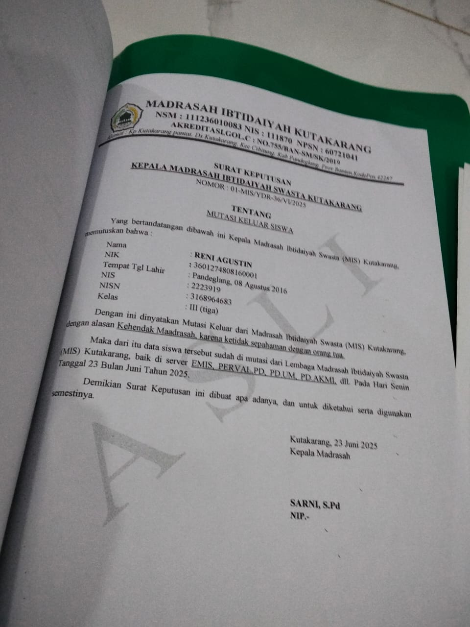 Liputanabn.com | Pandeglang – Sebuah insiden yang menimbulkan keprihatinan terjadi di Sekolah Madrasah Ibtidaiyah Swasta Kuta Karang. Desa Kuta Karang Kecamatan Cibitung .Kabupaten Pandeglang Provinsi Banten .Diduga salah satu oknum guru, berinisial (Si), telah memberhentikan seorang siswa tanpa melakukan musyawarah atau mendapat persetujuan dari orang tua siswa sebelumnya.Kamis 17 Juli 2025