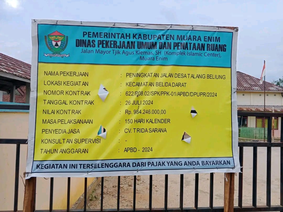 Peningkatan Jalan Desa Talang Beliung, 26- juli-2024. Nilai kontrak Rp 984.246 000.00