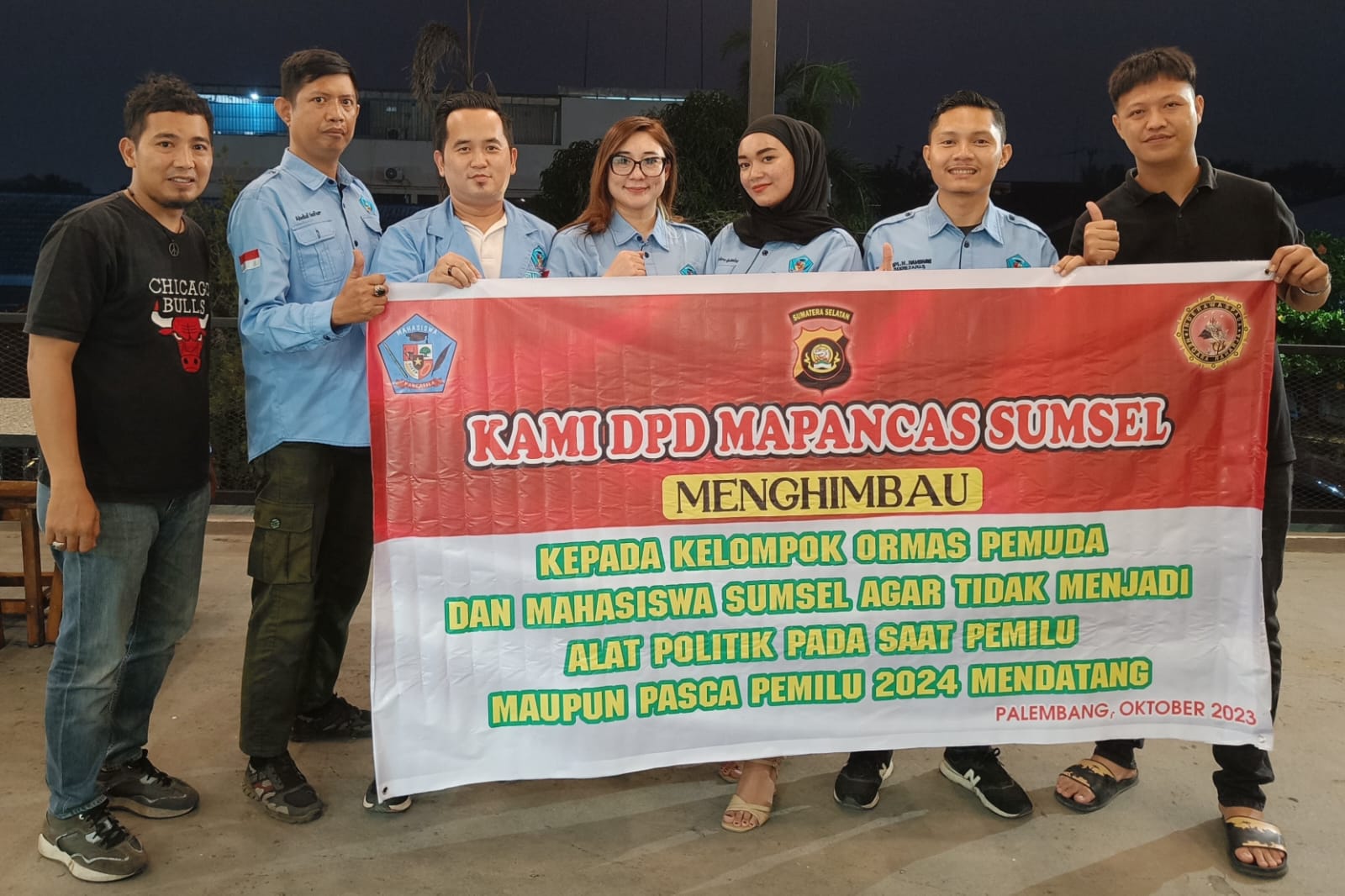 PJ Ketua DPD Mapancas Sumsel Heksa didampingi wakil Ketua III Ria Nopianti beserta rekan mapancas lainnya menyerukan seluruh elemen mahasiswa, stakeholder dan khususnya para peserta Pemilu 2024 untuk merealisasikan budaya santun berpolitik.