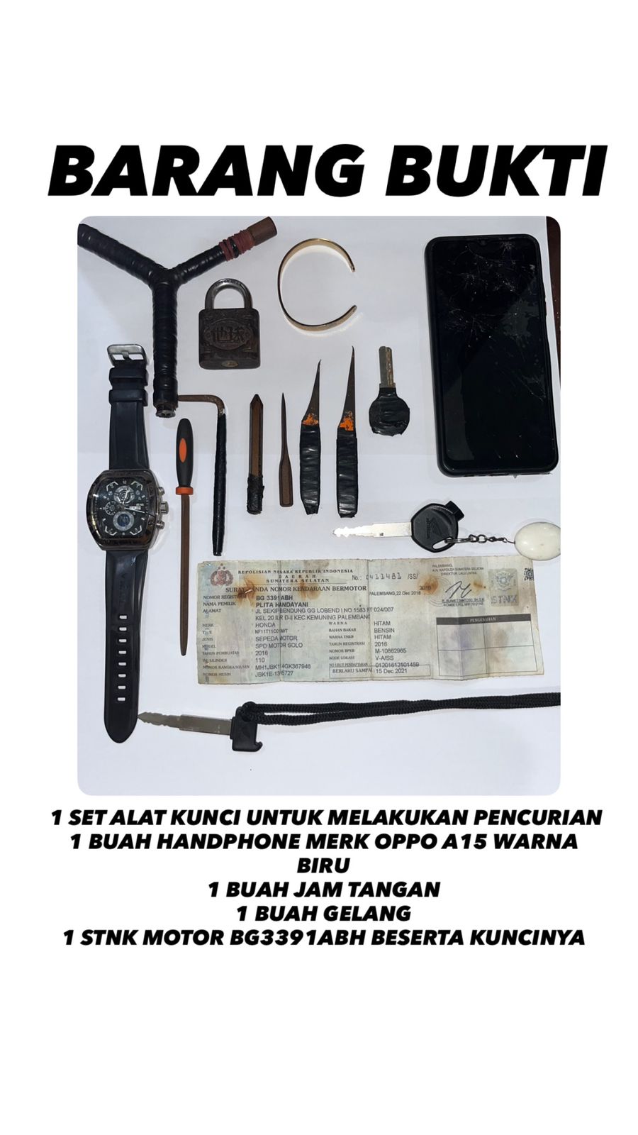 Dalam penangkapan tersebut, petugas juga berhasil mengamankan sejumlah barang bukti penting, antara lain kunci Y modifikasi, besi kikir, mata obeng khusus, gembok rusak, hingga sepeda motor yang digunakan pelaku saat beraksi. Selain itu, sepeda motor hasil curian juga berhasil diamankan, termasuk bukti transaksi penjualan berupa uang tunai yang telah dibagi-bagi antar pelaku.