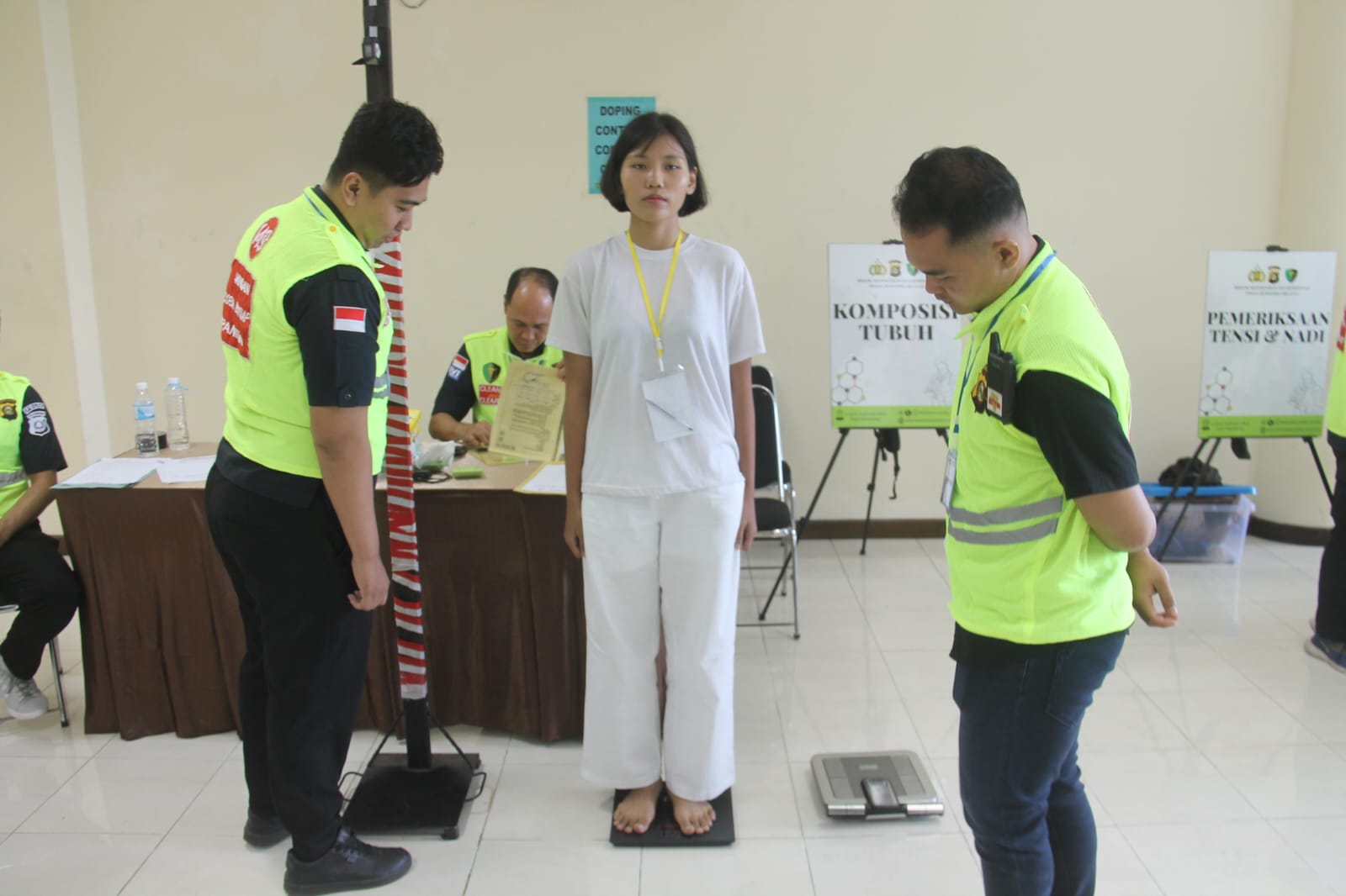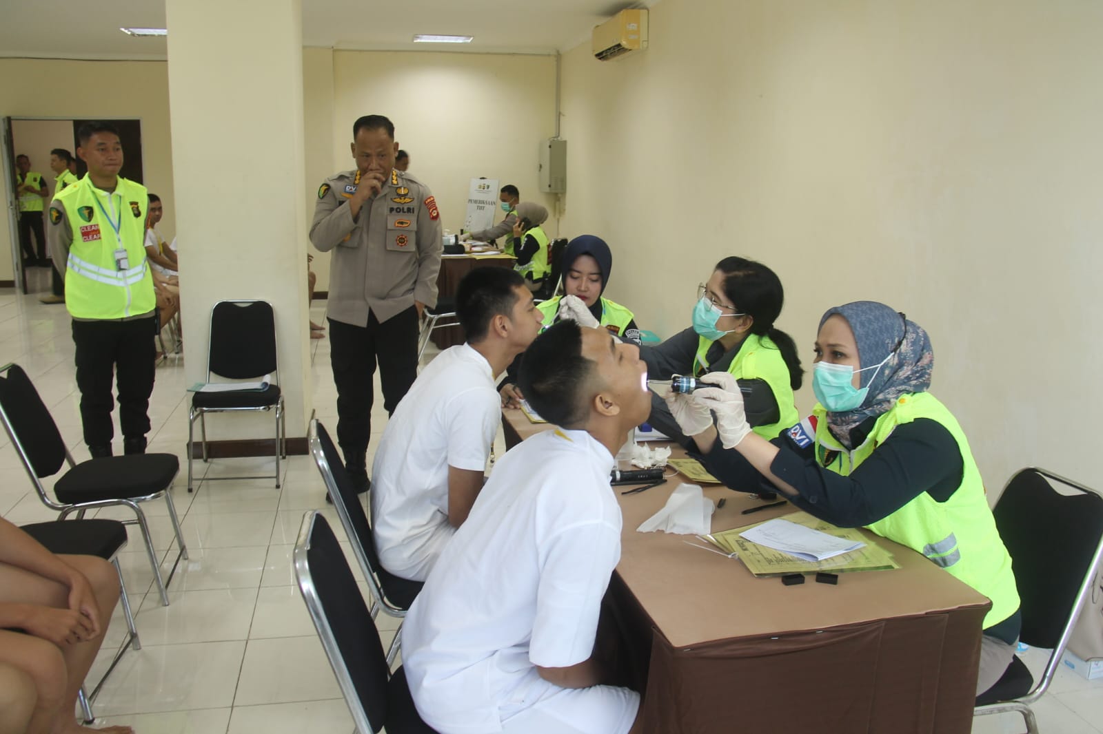 Selanjutnya, tim medis melaksanakan tujuh komponen pemeriksaan kesehatan yang meliputi pemeriksaan mata, THT, gigi, komposisi tubuh, tekanan darah, denyut nadi, serta pemeriksaan fisik menyeluruh. Setelah seluruh tahapan selesai, panitia langsung mengumumkan hasil pemeriksaan melalui layar proyektor pada hari yang sama.