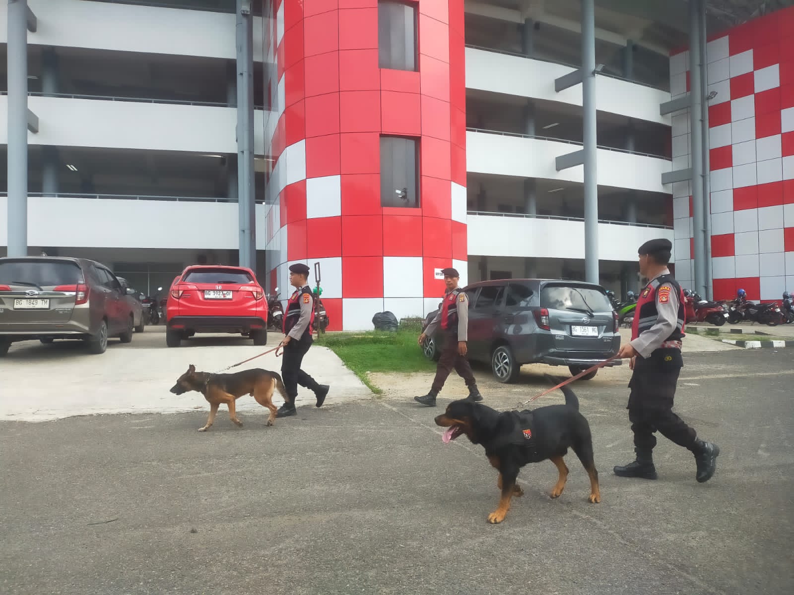 Dua ekor anjing pelacak dari Unit K9 bersama lima personel yang dipimpin Ka Tim K9 Aipda Saripudin diterjunkan untuk menyisir area strategis stadion, mulai dari pintu masuk penonton, tribun utama, hingga ring luar. Pemeriksaan dilakukan secara cermat untuk memastikan tidak ada benda berbahaya atau ancaman yang dapat mengganggu jalannya pertandingan.