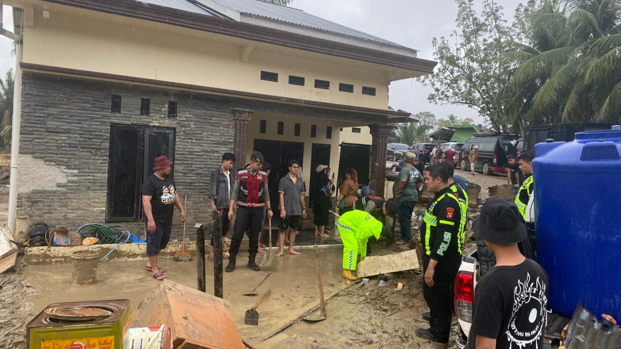 Tim Satgas juga bergerak untuk membersihkan rumah penduduk yang terdampak bencana dan membantu masyarakat dengan memberikan makanan instan berupa mie kemasan