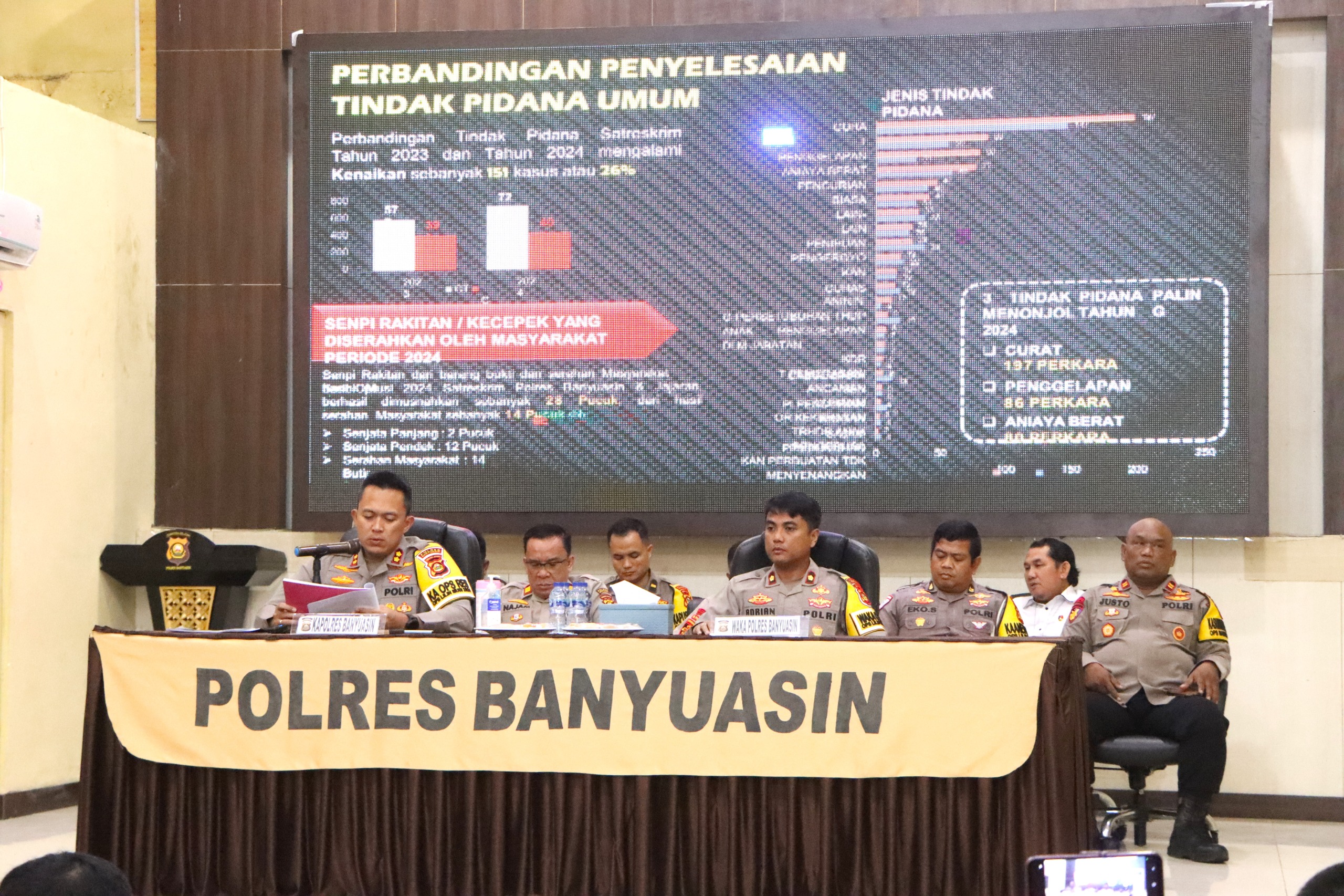 Dalam perbandingan antara tahun 2023 dan 2024, Polres Banyuasin mencatatkan kenaikan kasus tindak pidana sebesar 26%, dengan total 728 kasus pada tahun 2024, dibandingkan dengan 577 kasus pada tahun sebelumnya. Namun, Kapolres menjelaskan bahwa meski terdapat kenaikan, penyelesaian perkara tindak pidana tahun 2024 masih berjalan, dengan 407 kasus yang sudah selesai. Kasus yang paling menonjol sepanjang tahun 2024 adalah pencurian dengan pemberatan (curat) sebanyak 197 kasus, penggelapan 86 kasus, dan penganiayaan berat yang mencapai 80 kasus.