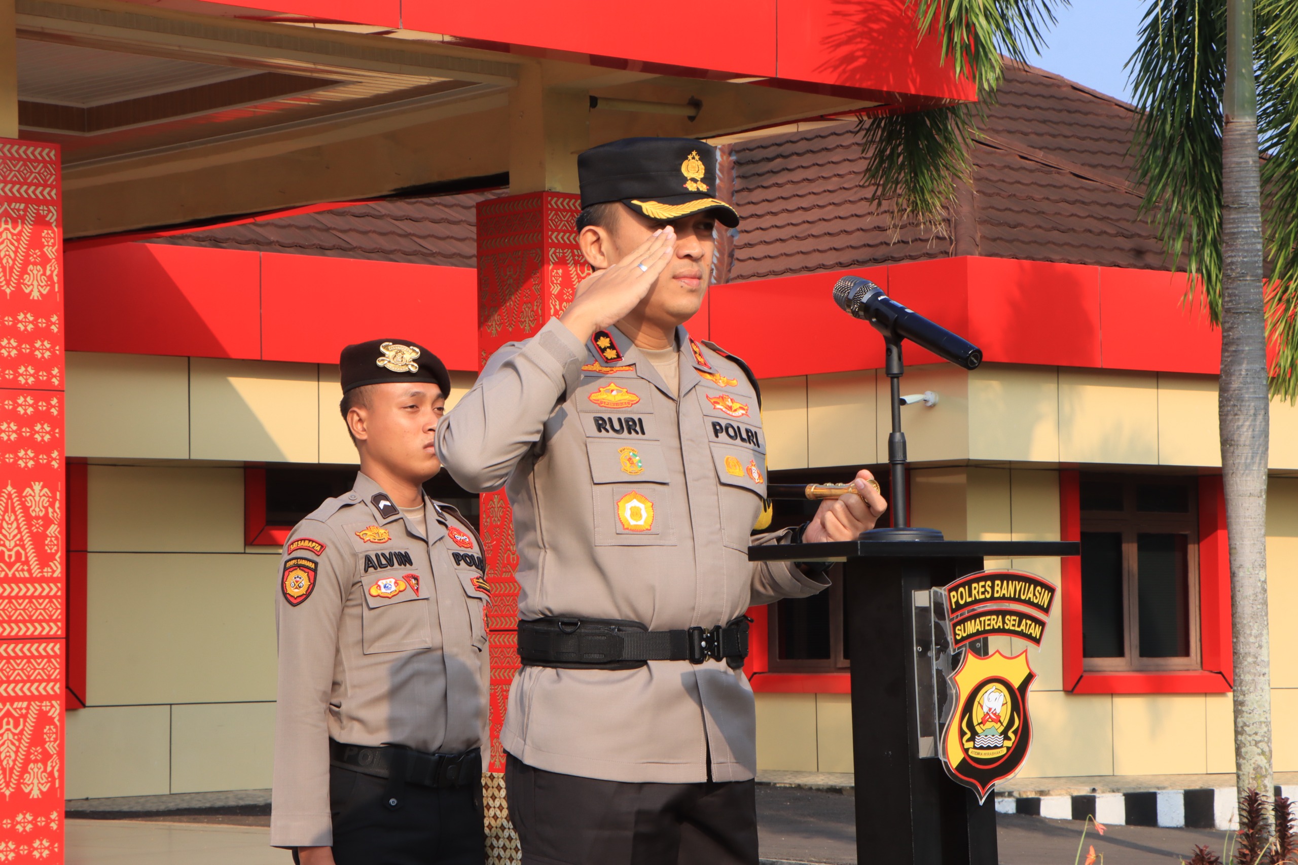 Upacara Tersebut dipimpin oleh AKBP Ruri Prastowo SH SIK MIK selaku Kapolres Banyuasin dan diikuti oleh Pejabat Utama (PJU) Polres Banyuasin dan Perwira, Bintara serta ASN Polres Banyuasin