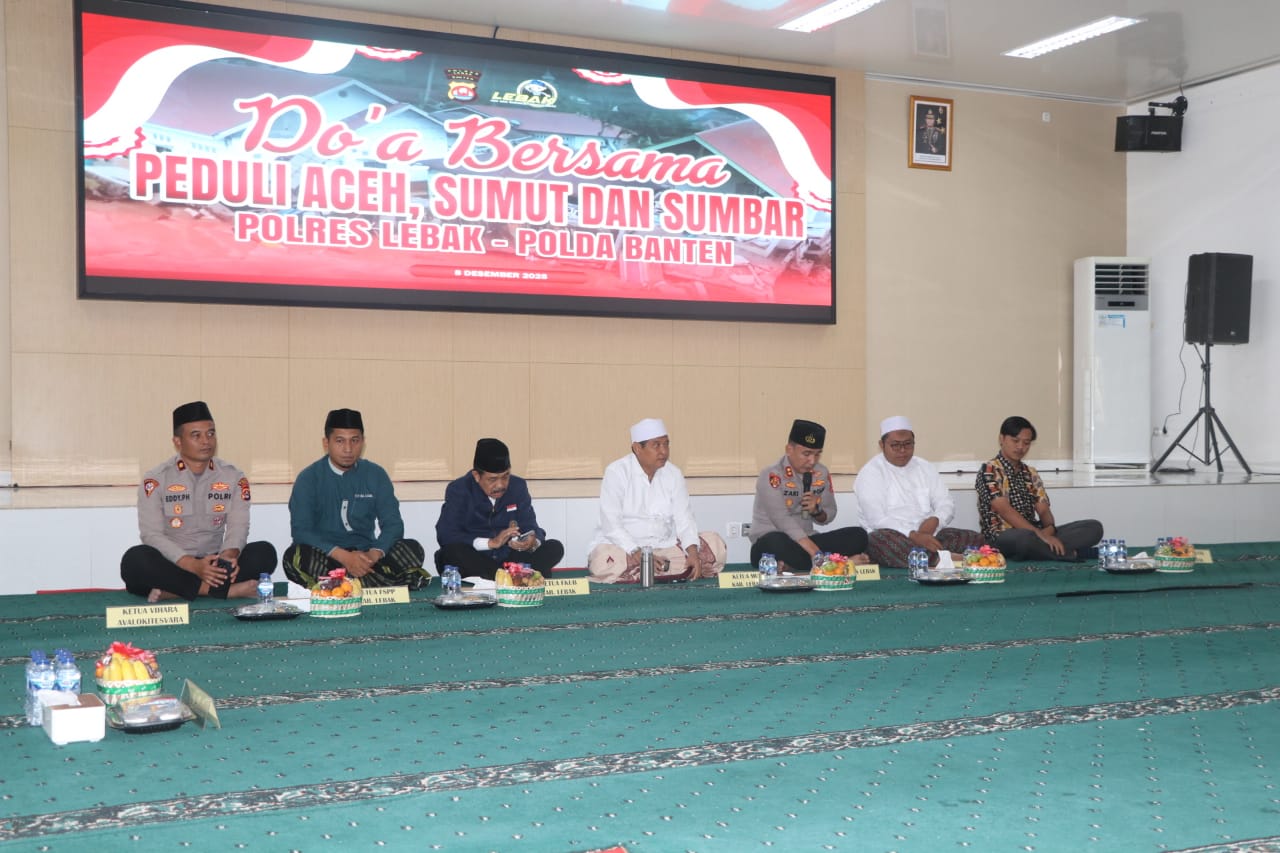 Liputanabn.com | Lebak – Sebagai bentuk kepedulian dan empati terhadap para korban bencana alam di Aceh, Sumatera Utara, dan Sumatera Barat, Polres Lebak Polda Banten menggelar kegiatan Doa Bersama Peduli Aceh, Sumut, dan Sumbar yang bertempat di Aula Bawah Polres Lebak, Senin (8/12/2025) sore.