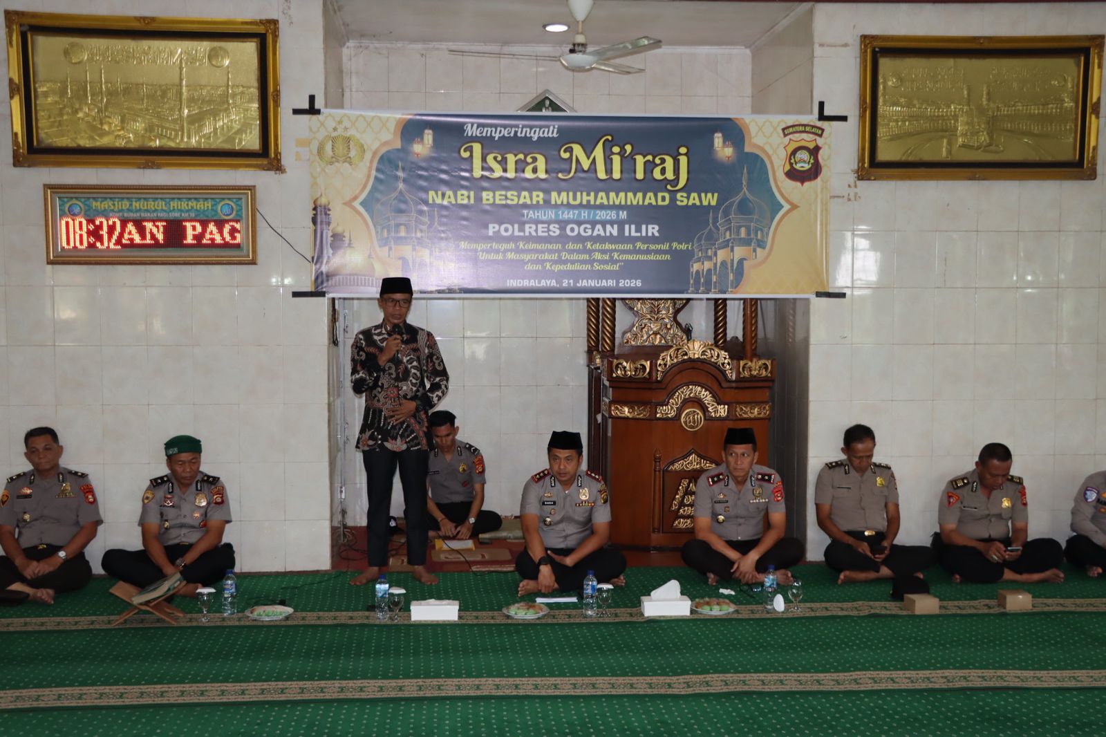 Dalam sambutannya, Kapolres Ogan Ilir menyampaikan bahwa Isra Mi’raj merupakan peristiwa luar biasa dan mukjizat agung Nabi Muhammad SAW, di mana Rasulullah SAW menerima perintah sholat lima waktu sebagai pondasi utama pembentukan karakter dan disiplin umat Islam. Kapolres menekankan pentingnya personel Polres Ogan Ilir untuk mengimplementasikan nilai-nilai keimanan, kejujuran, kesabaran, dan tanggung jawab, sebagaimana dicontohkan Nabi Muhammad SAW, dalam menjalankan tugas sebagai pelindung, pengayom, dan pelayan masyarakat.
