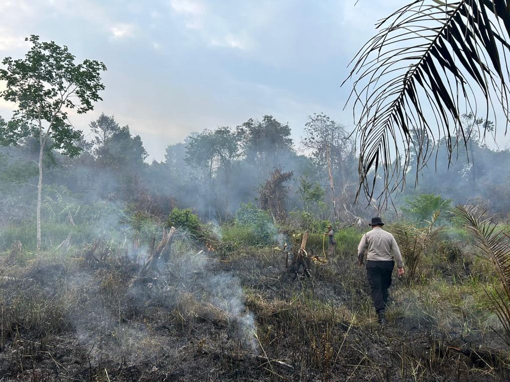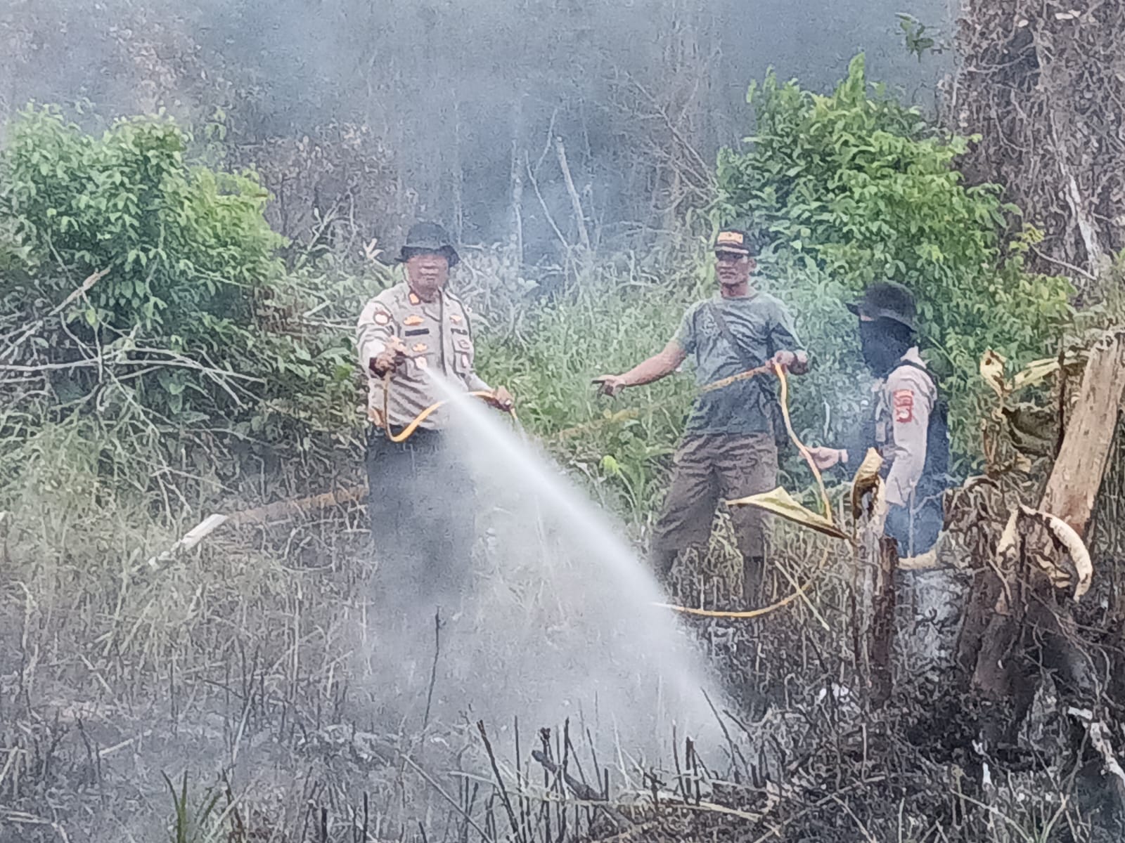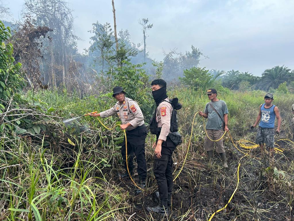 Setelah mengamankan pelaku, Personil Polsek Bayug Lincir langsung melakukan pemadaman api di tempat kejadian kebakaran lahan tersebut.